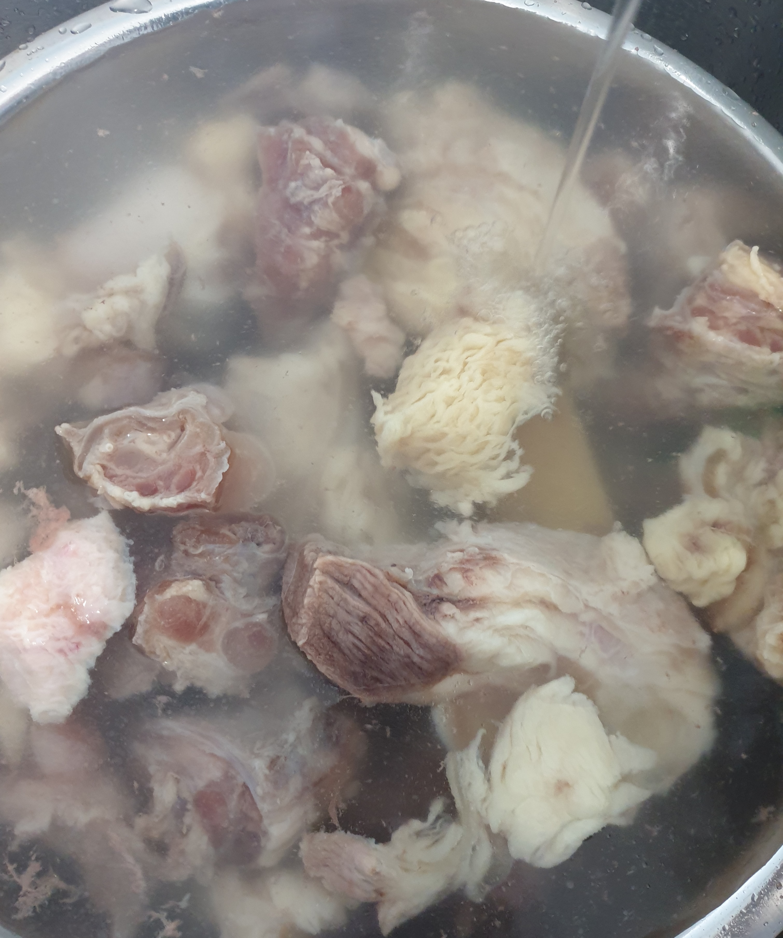 핏물을 뺀 도가니와 스지를 애벌로 한번 팔팔 끓여줬어요
