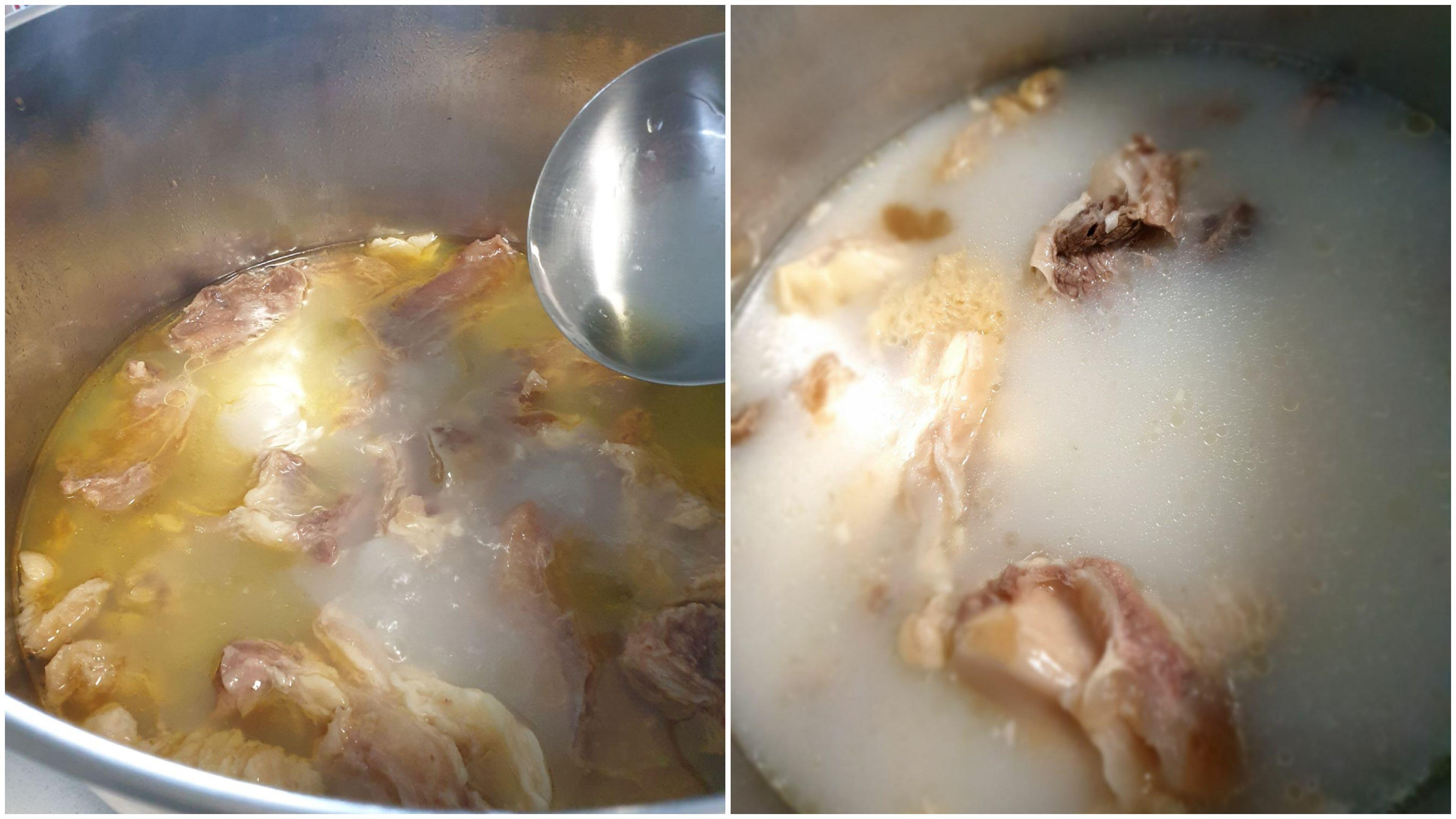 기름을 걷어내 주면 뽀얀 육수가 나와요