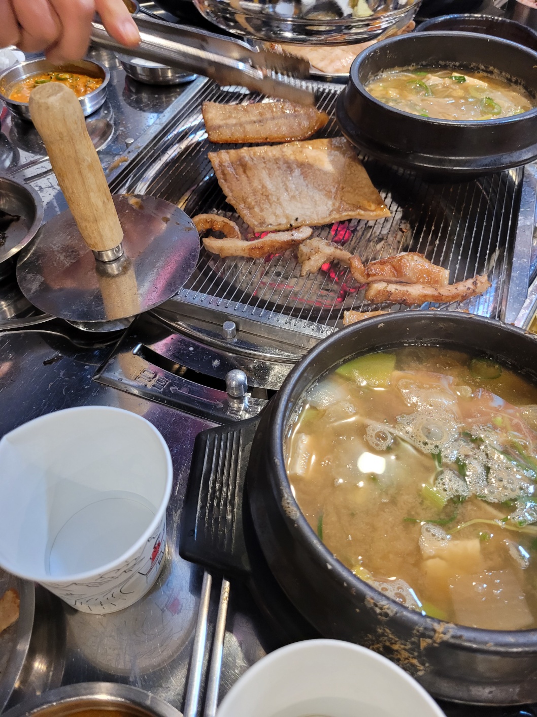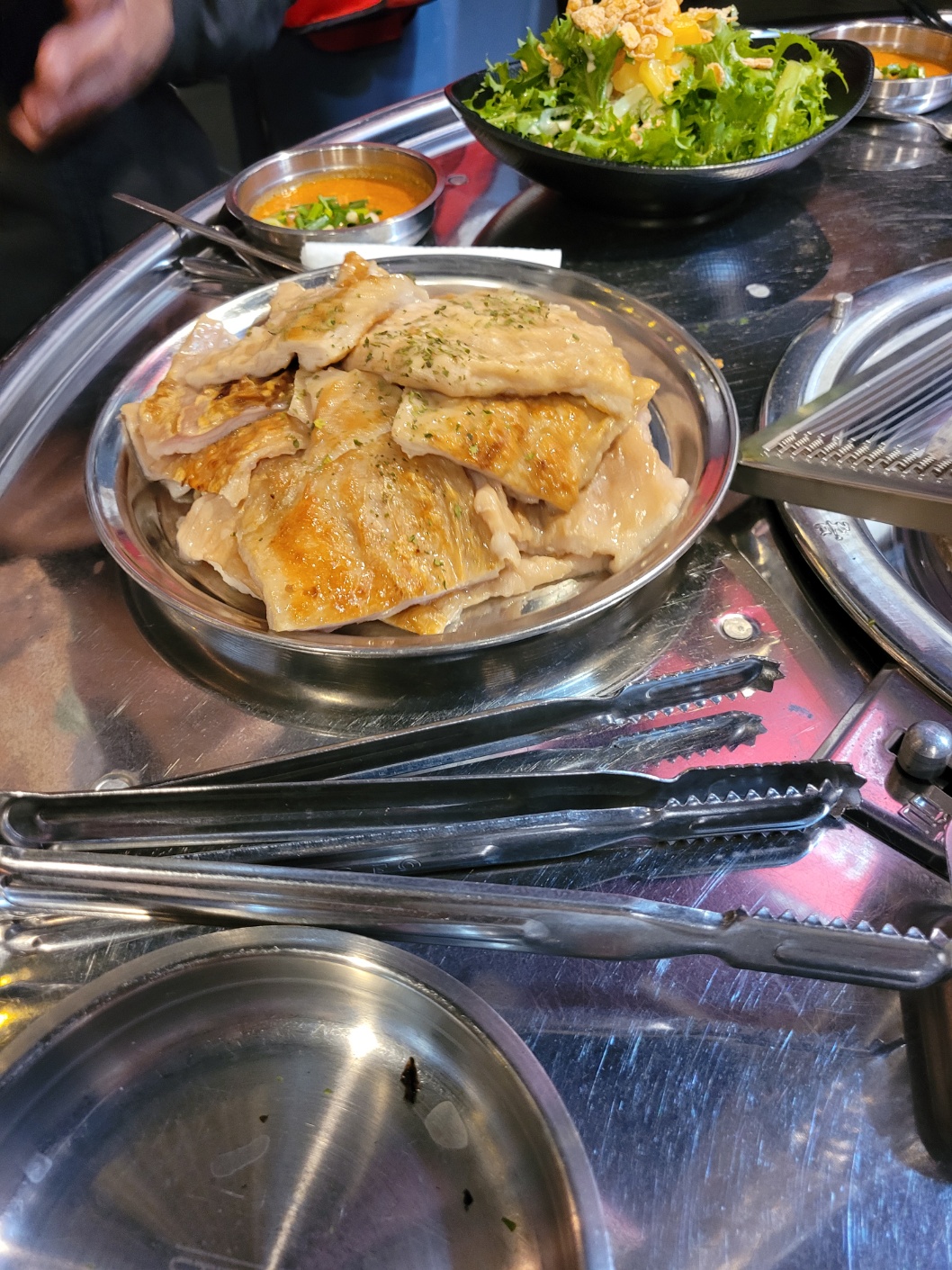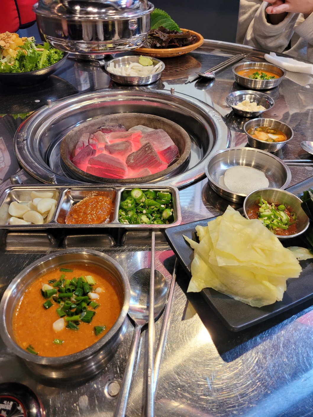 불이 들어오고 샐러드, 콘치즈, 막장, 양배추, 김 등 곁들임 반찬들이 나왔다.