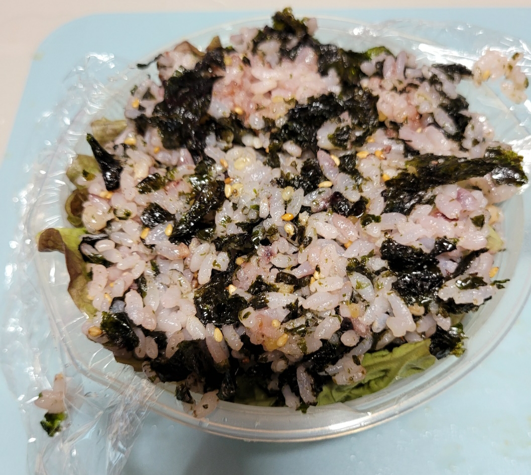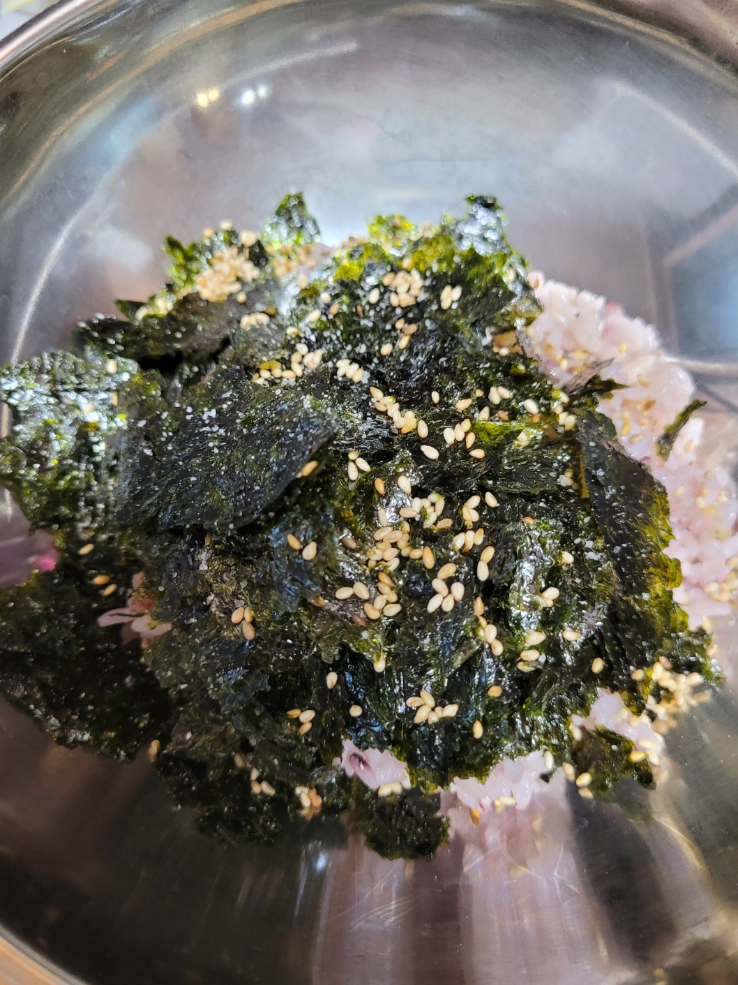 그릇에 밥 한 공기와 김가루, 깨