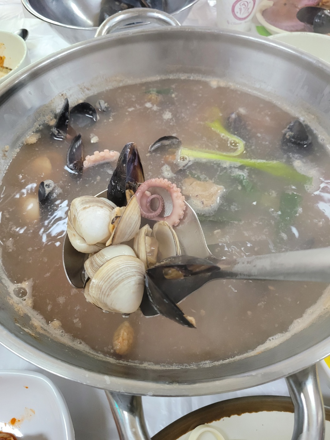 진하게 우러난 해물 육수에 칼국수 면을 넣어 국수까지 끓여 먹는 방식이다.
