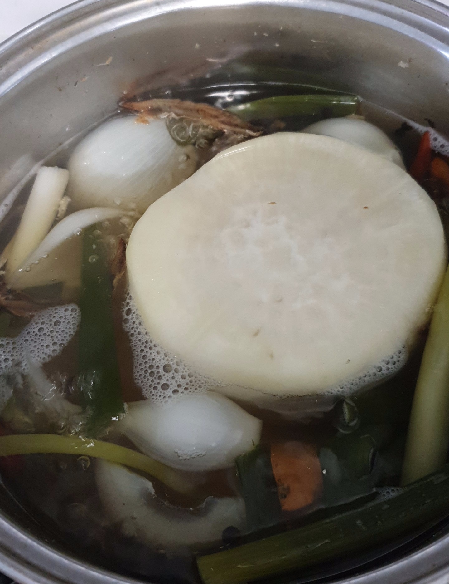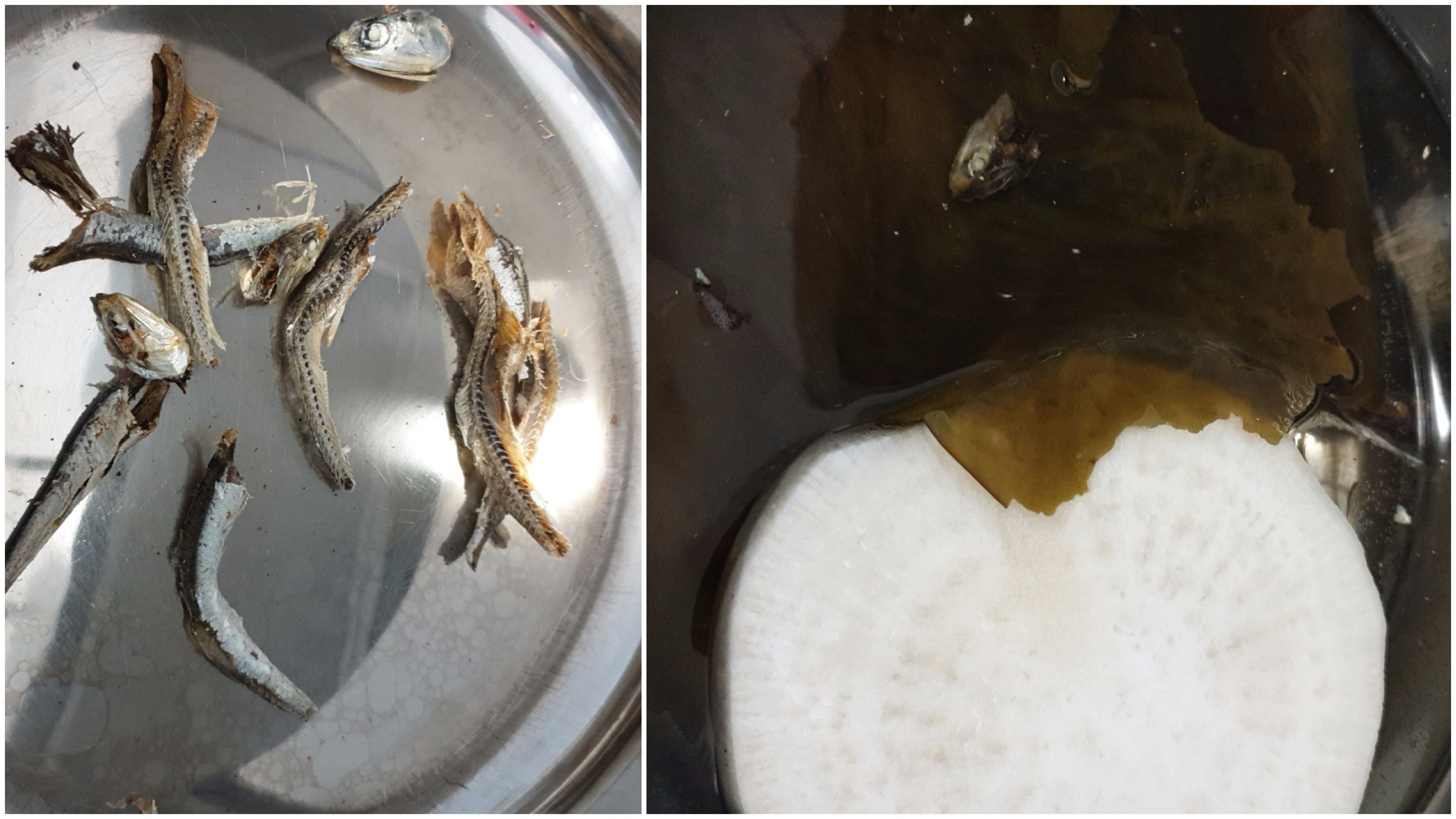 재료- 멸치, 다시마, 무, 대파, 통후추, 베트남 고추, 양파, 어묵