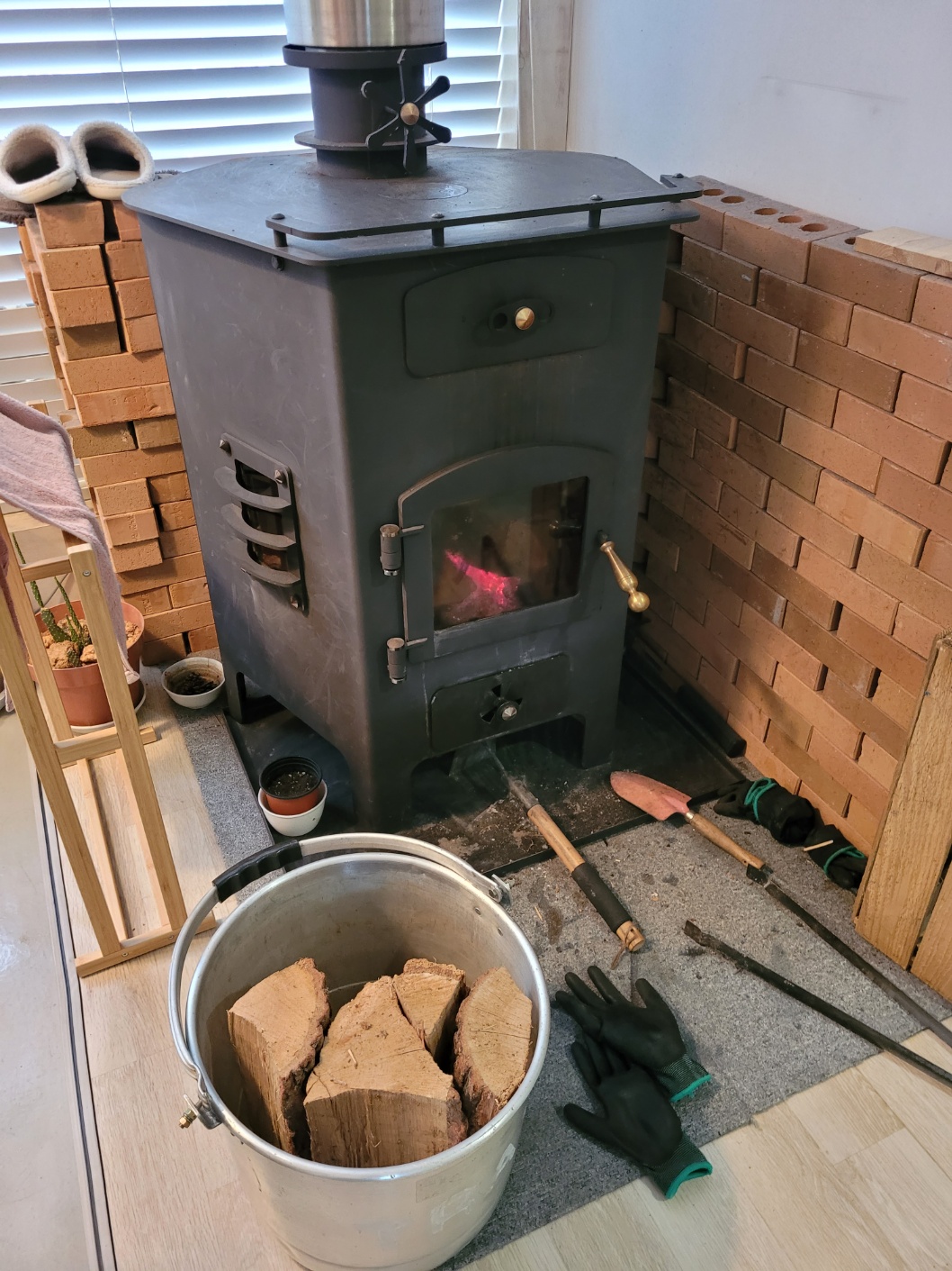 언니는 집 공기가 따뜻해지도록 장작을 태우고