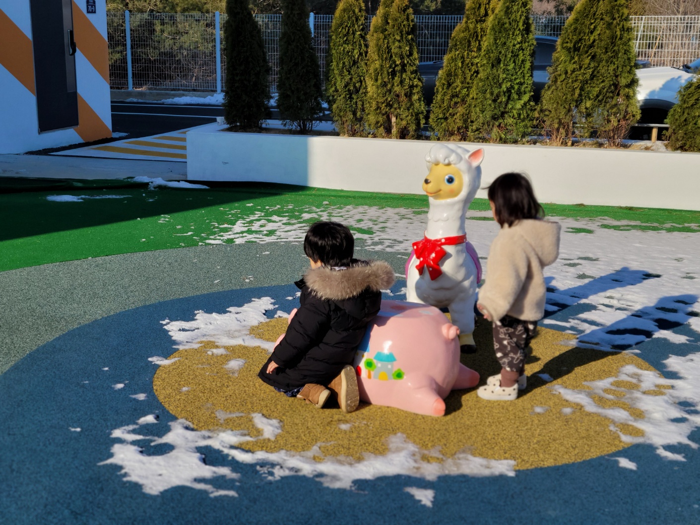 동물 모형들도 있고, 밖에서 탈 수 있는 전동 자동차도 여러대 있는데, 땅이 살짝 얼어있어서 덮개로 덮어 놓으셨다.