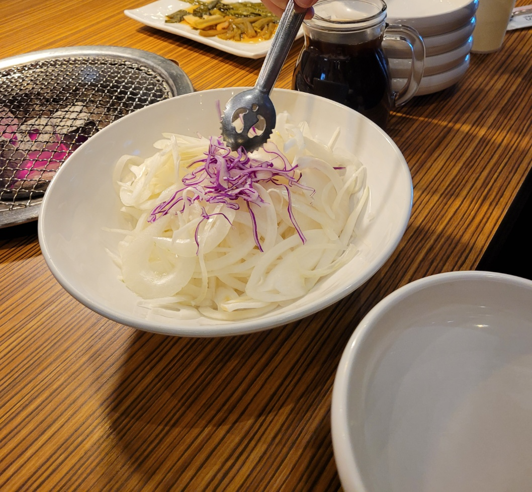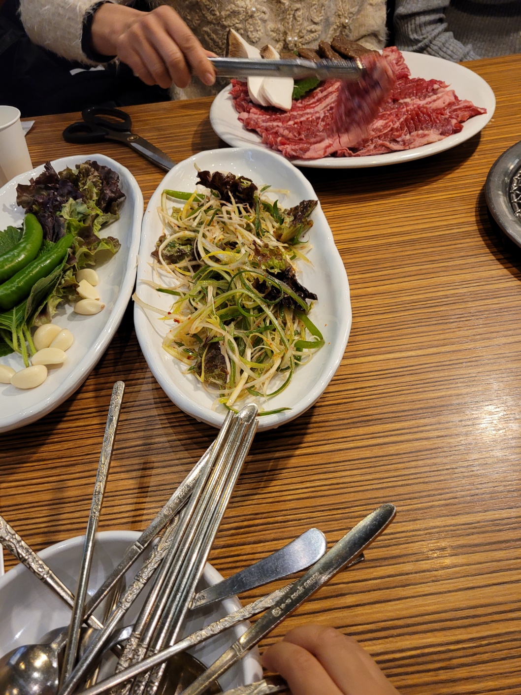 상차림은 파채, 쌈채소, 양파 (간장 따로), 백김치, 장아찌, 명이나물이 나온다.