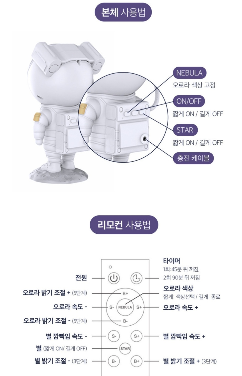 리모컨으로 타이머와 오로라 밝기조절 등 도 가능해서 사용이 편리하다.