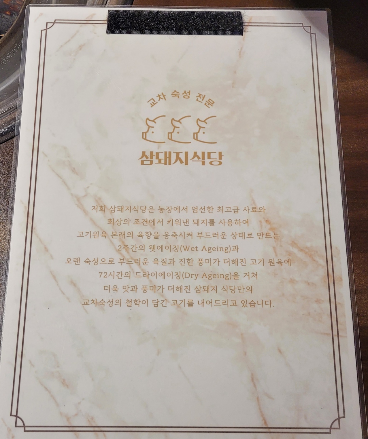 저희 삼돼지 식당은 농장에서 엄선한 최고급 사료와 최상의 조건에서 키워낸 돼지를 사용하여 고기원육 본래의 육향을 응축시켜 부드러운 상태로 만드는 2주간의 웻에이징과 오랜 숙성으로 부드러운 육질과 진한 풍미가 더해진 고기 원육에 72시간의 드라이에이징을 거쳐 더욱 맛과 풍미가 더해진 삼돼지 식당만의 교차숙성의 철학이 담긴 고기를 내어 드리고 있습니다.
