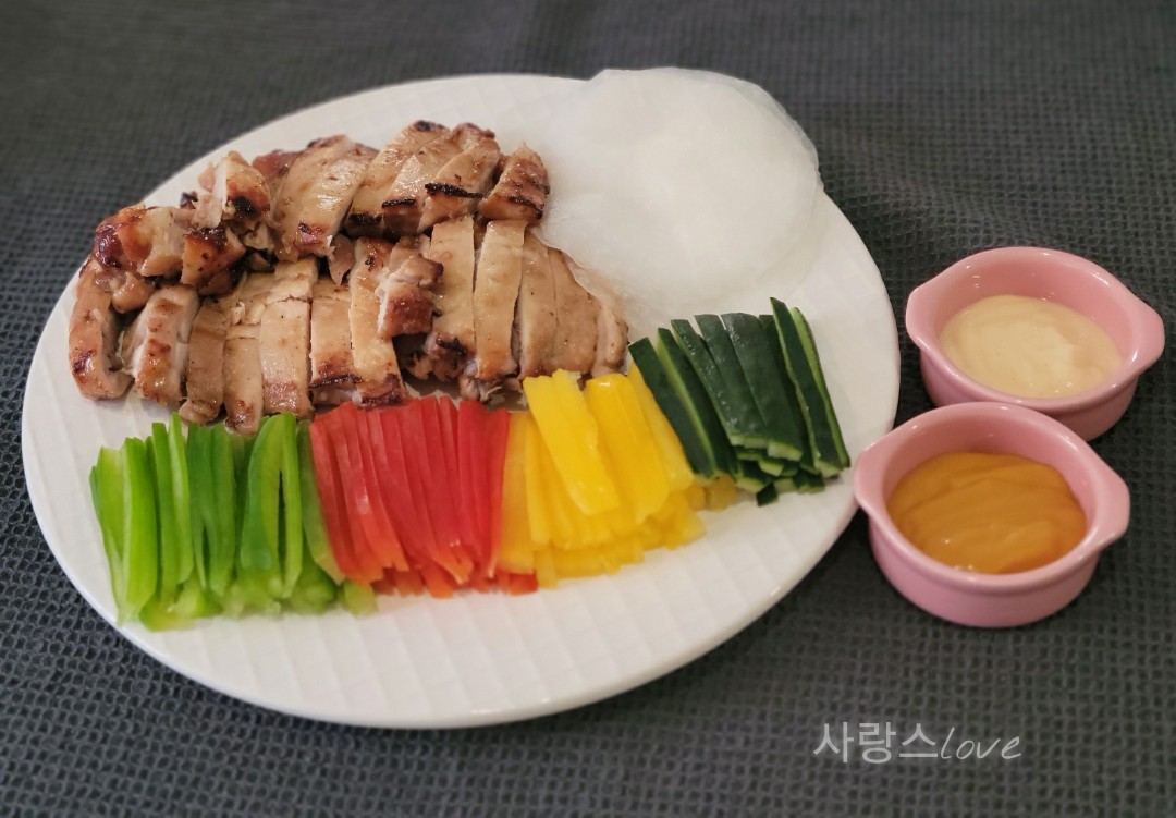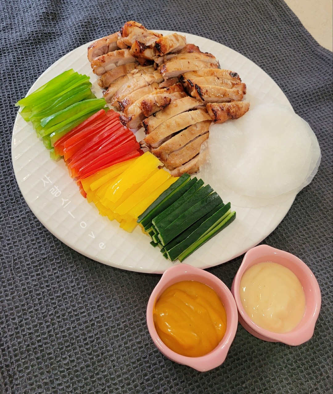 오늘의 요리 저의 다이어트는 계속 진행 중이에요 이번에는 닭안심살을 구워서 야채와 쌈무에 돌돌 말아 싸 먹었어요 누나홀닭의 후레쉬 쌈닭이 먹고 싶어 닭 안심살로 흉내만 냈어요 ㅎㅎ 재