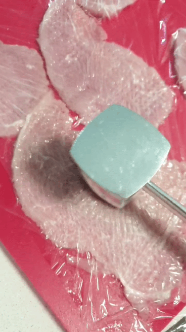 돈가스용 돼지고기를 연육 망치로 더더 얇게 펴주세요