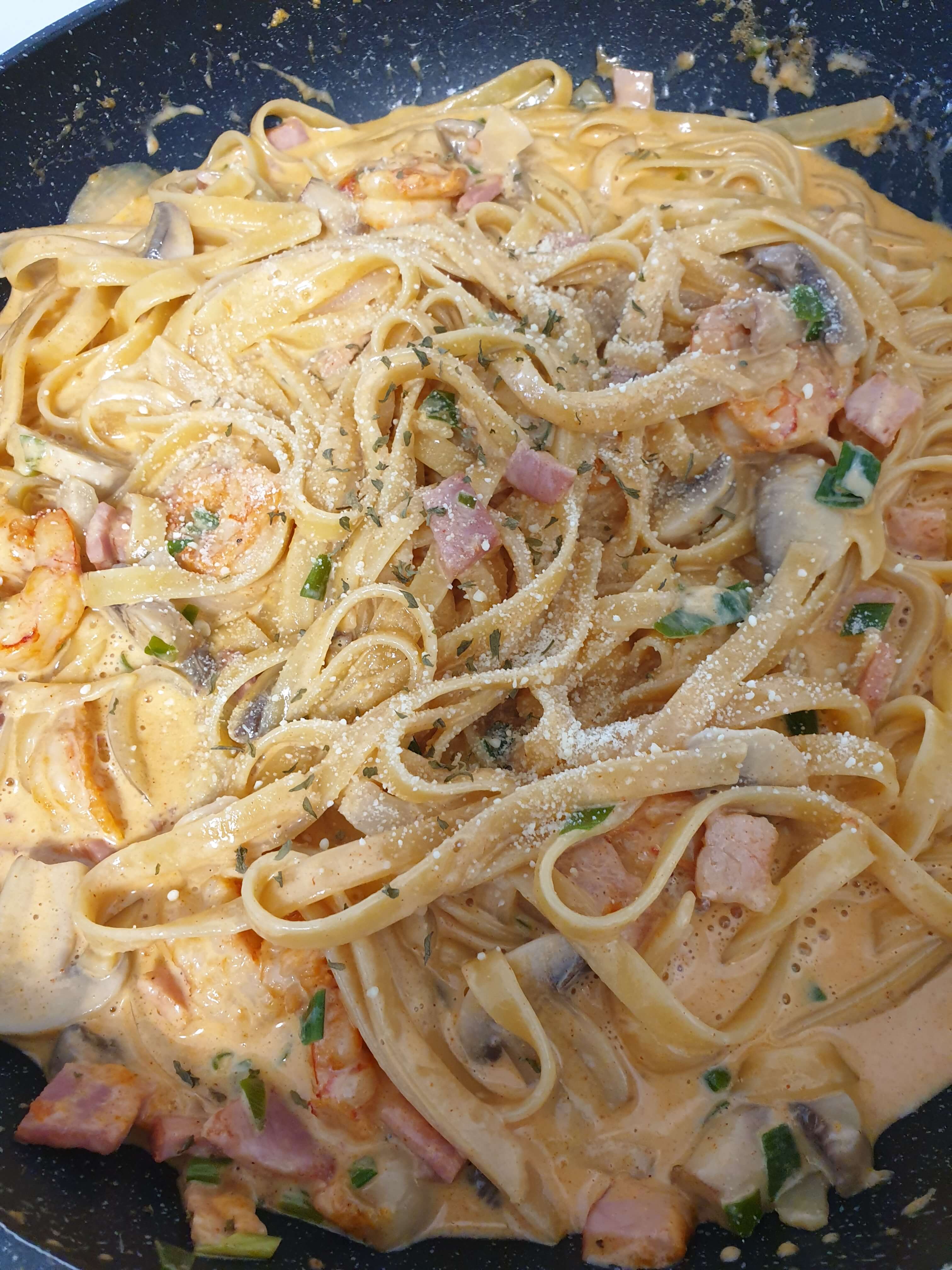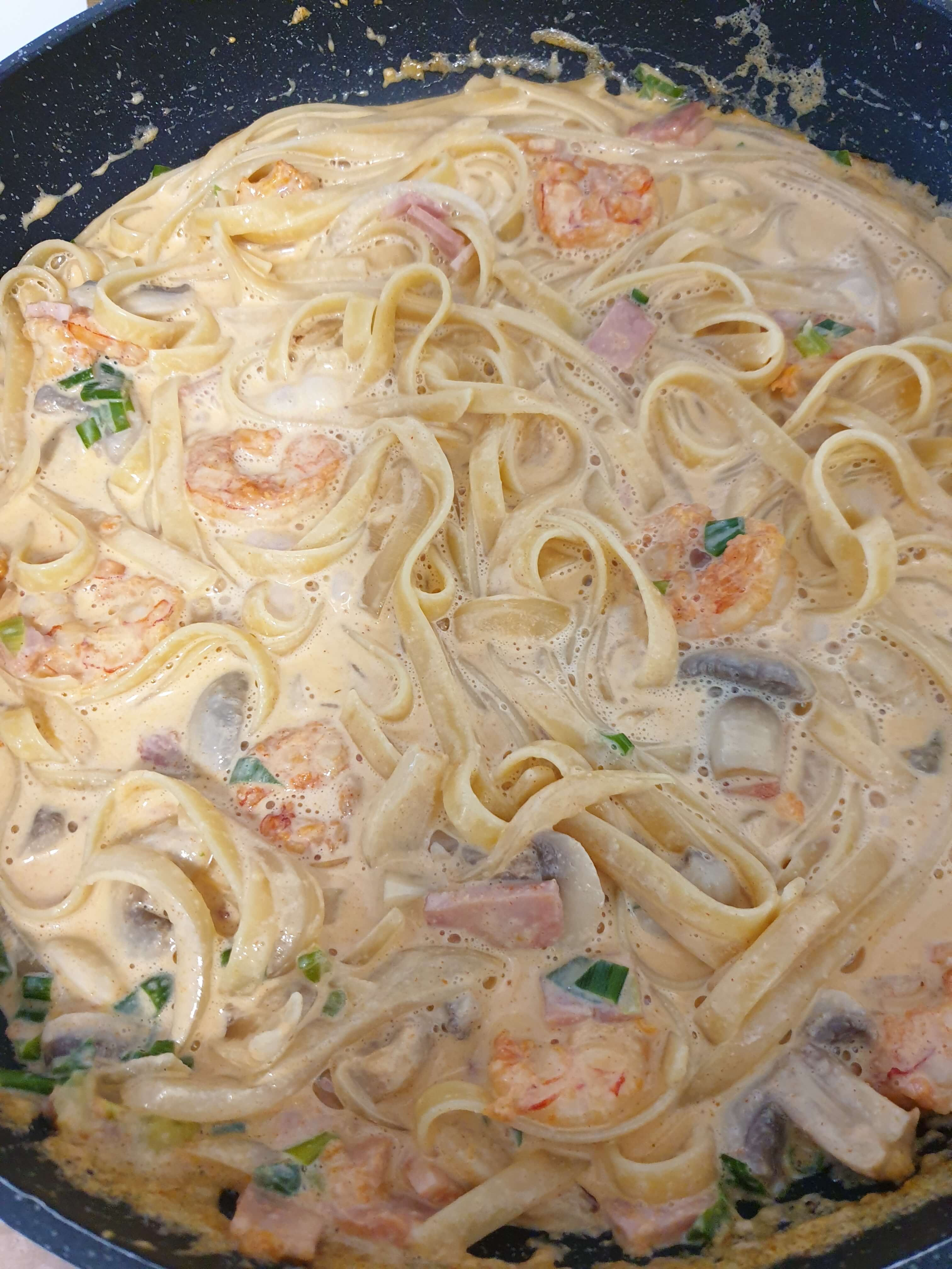 크림소스에 면을 건져 넣고 조금 더 꾸덕해지게 같이 끓여 주세요