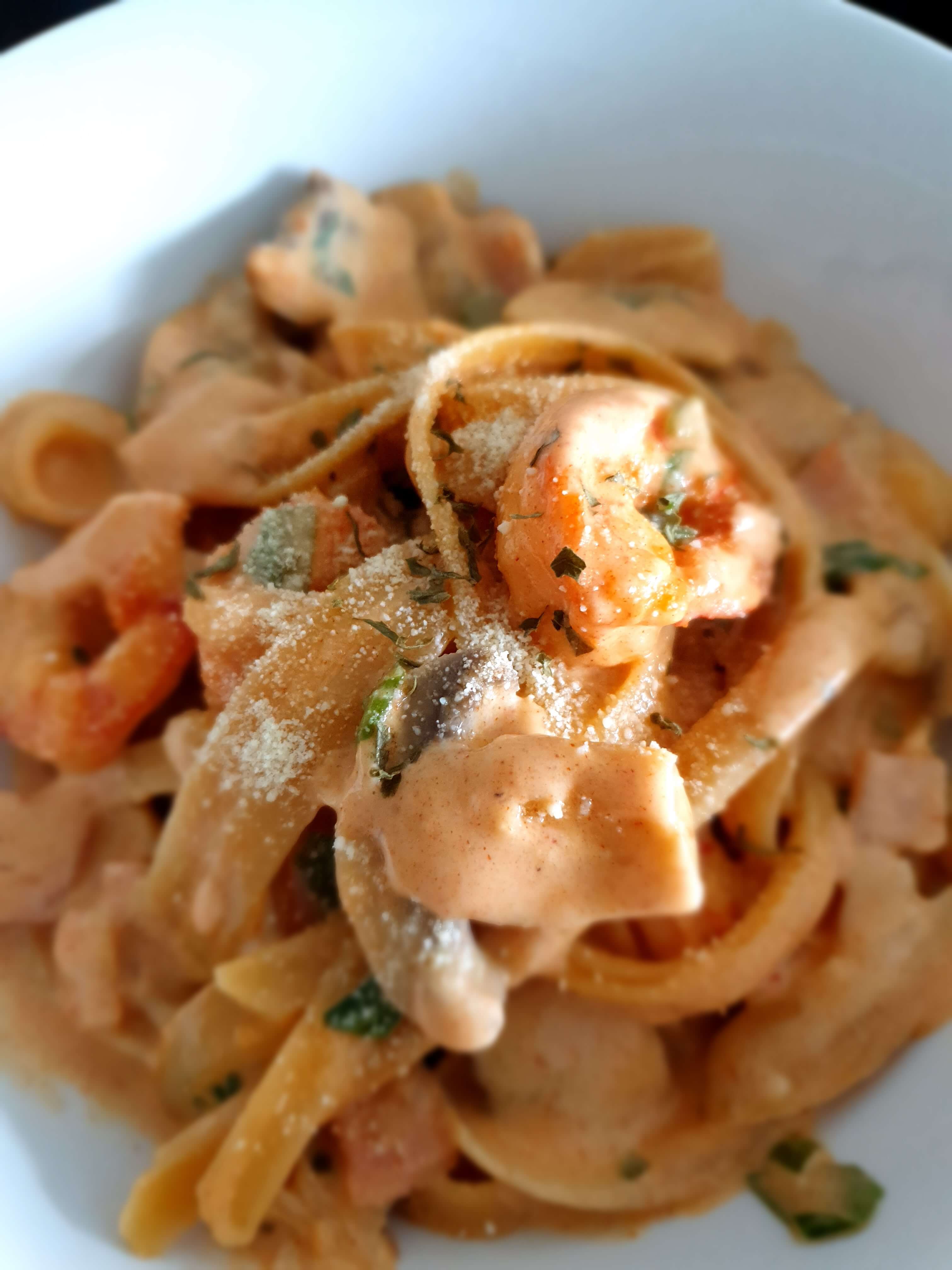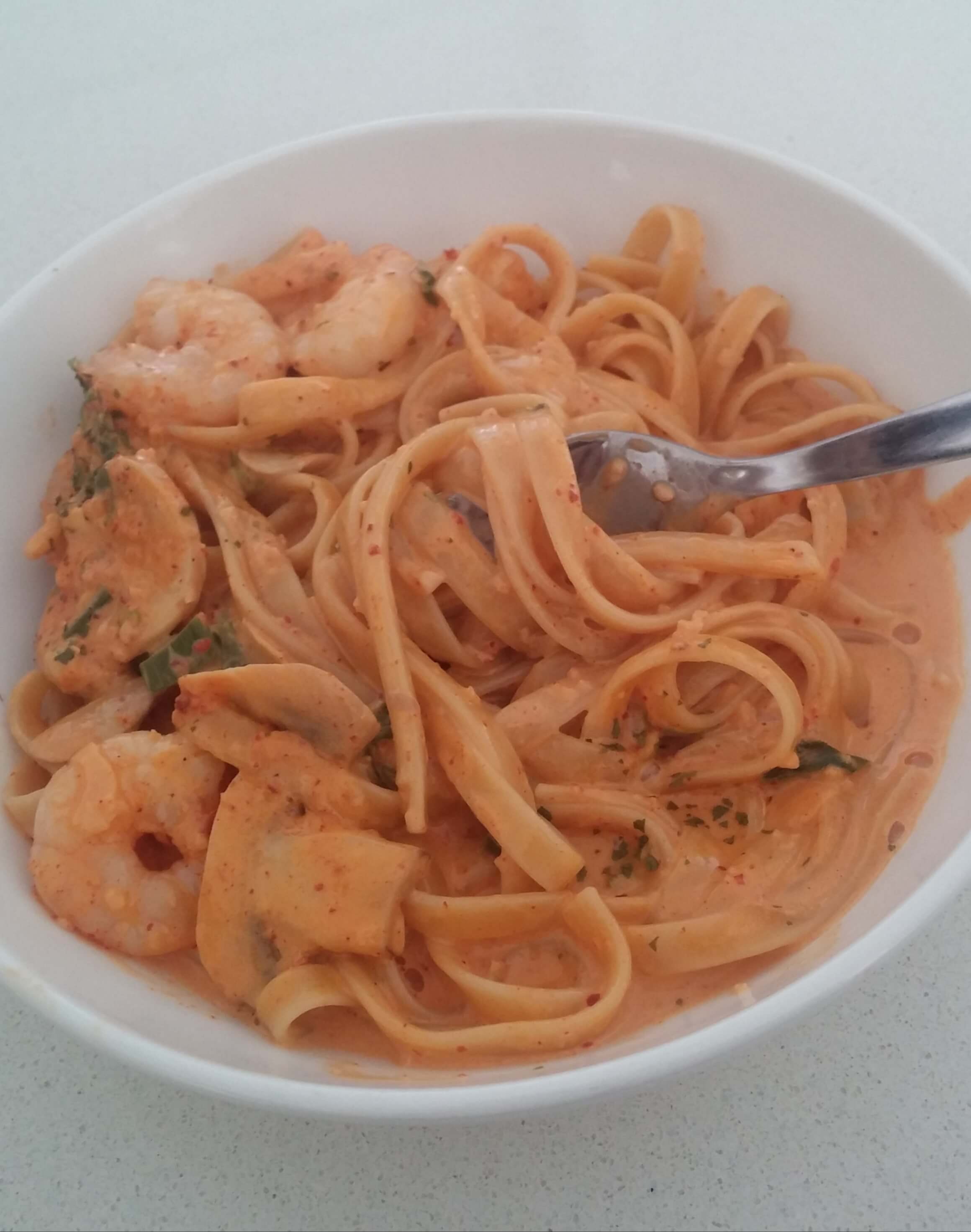 재료- 생크림, 우유, 간장, 후추, 새우, 고춧가루, 미림