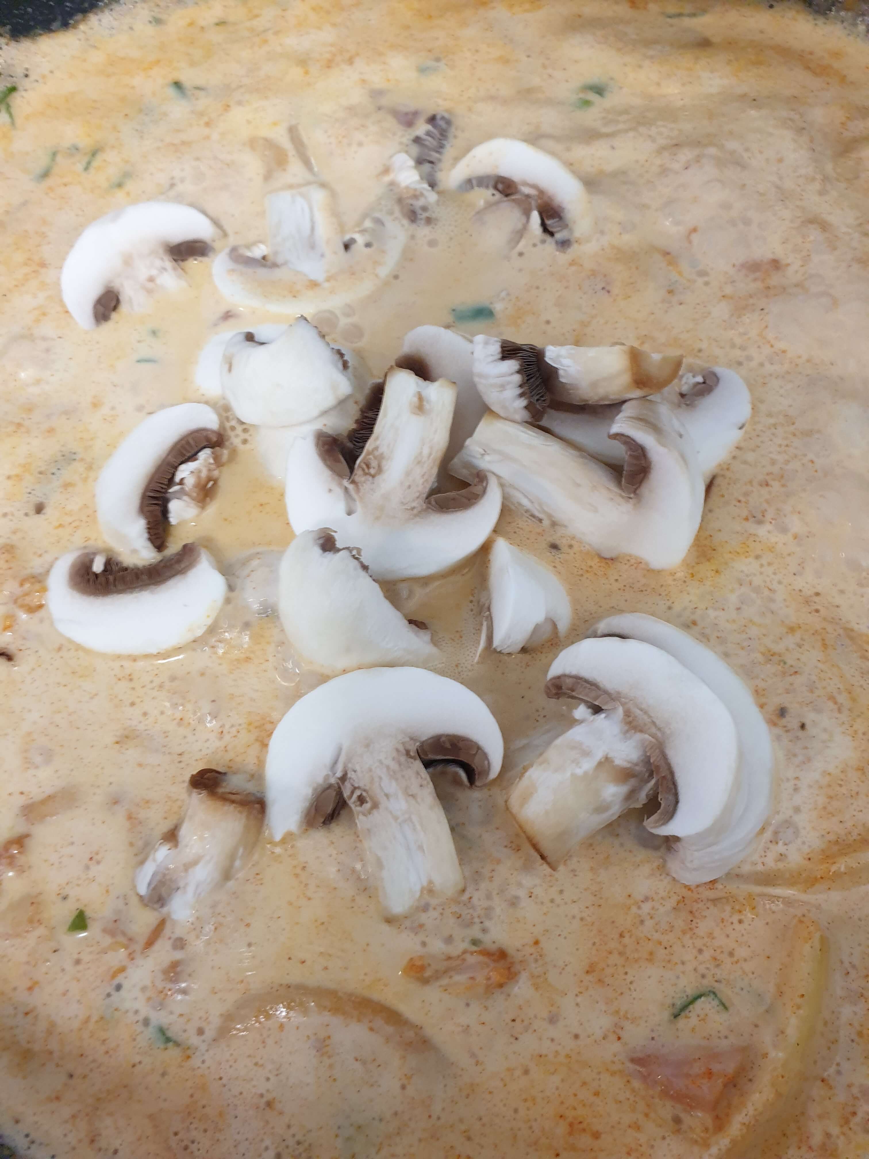 소스가 팔팔 끓으면 잘라 놓은 버섯도 넣어 주세요