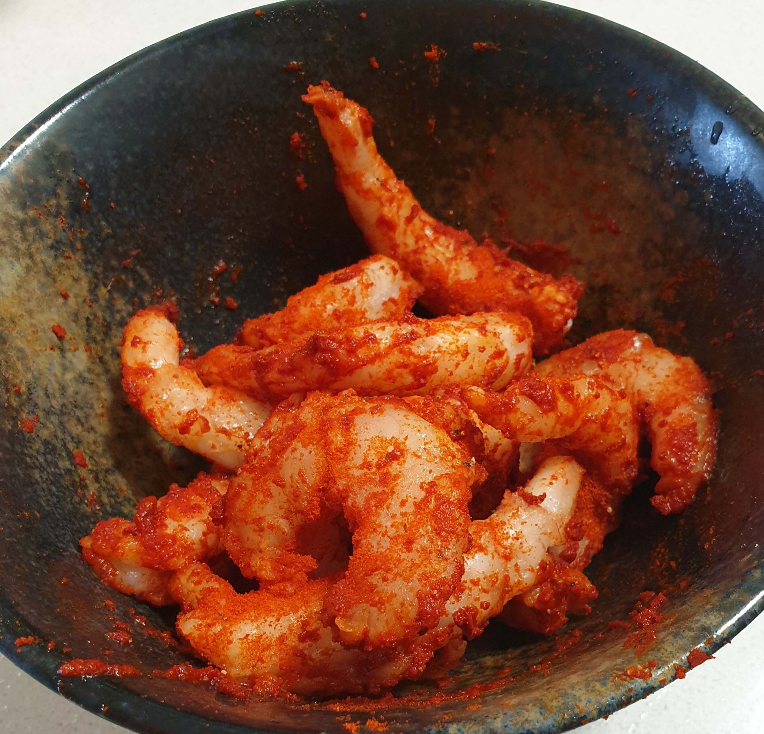 새우에 고춧가루 1큰술, 미림(맛술) 1큰술, 소금, 후추 넣고