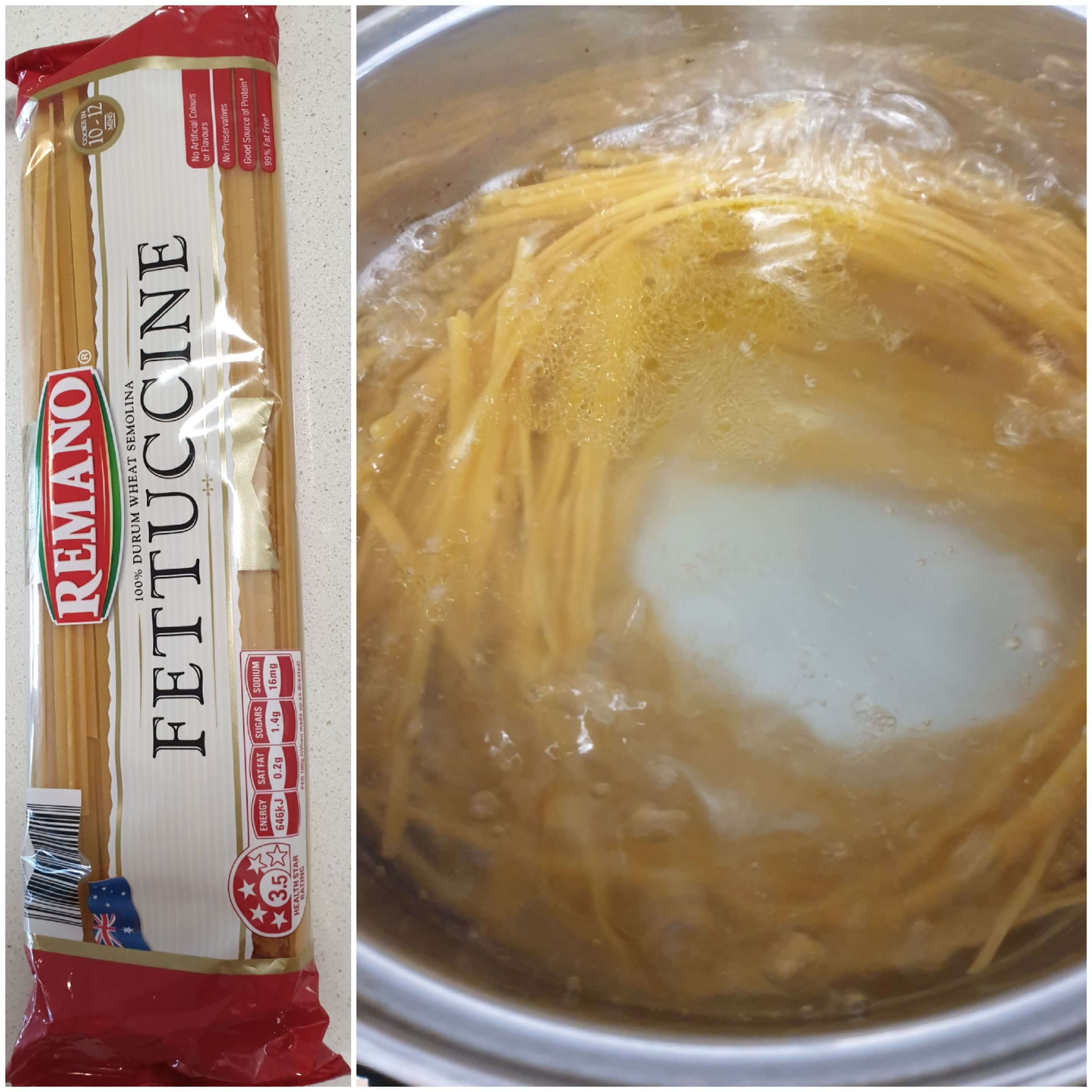 옆에서는 소금과 오일을 넣고 페투치네 면을 끓여 주세요