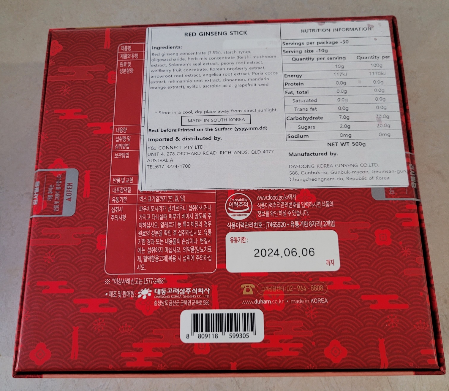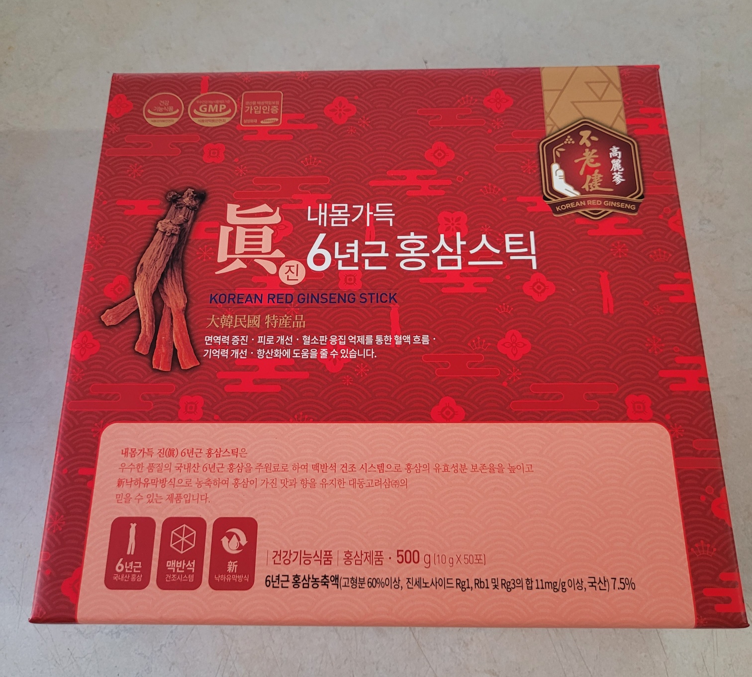 6년근 홍삼 농축액 (고형분 60% 이상, 진세노이드 Rg1, Rb1, Rg3 외 합 11mg/g이상, 국산) 7.5% 라고 하니, 지난번 먹었던 마시는 홍삼 (6년 근 홍삼농축액 0.6%) 보다 훨씬 좋은 것 같다.