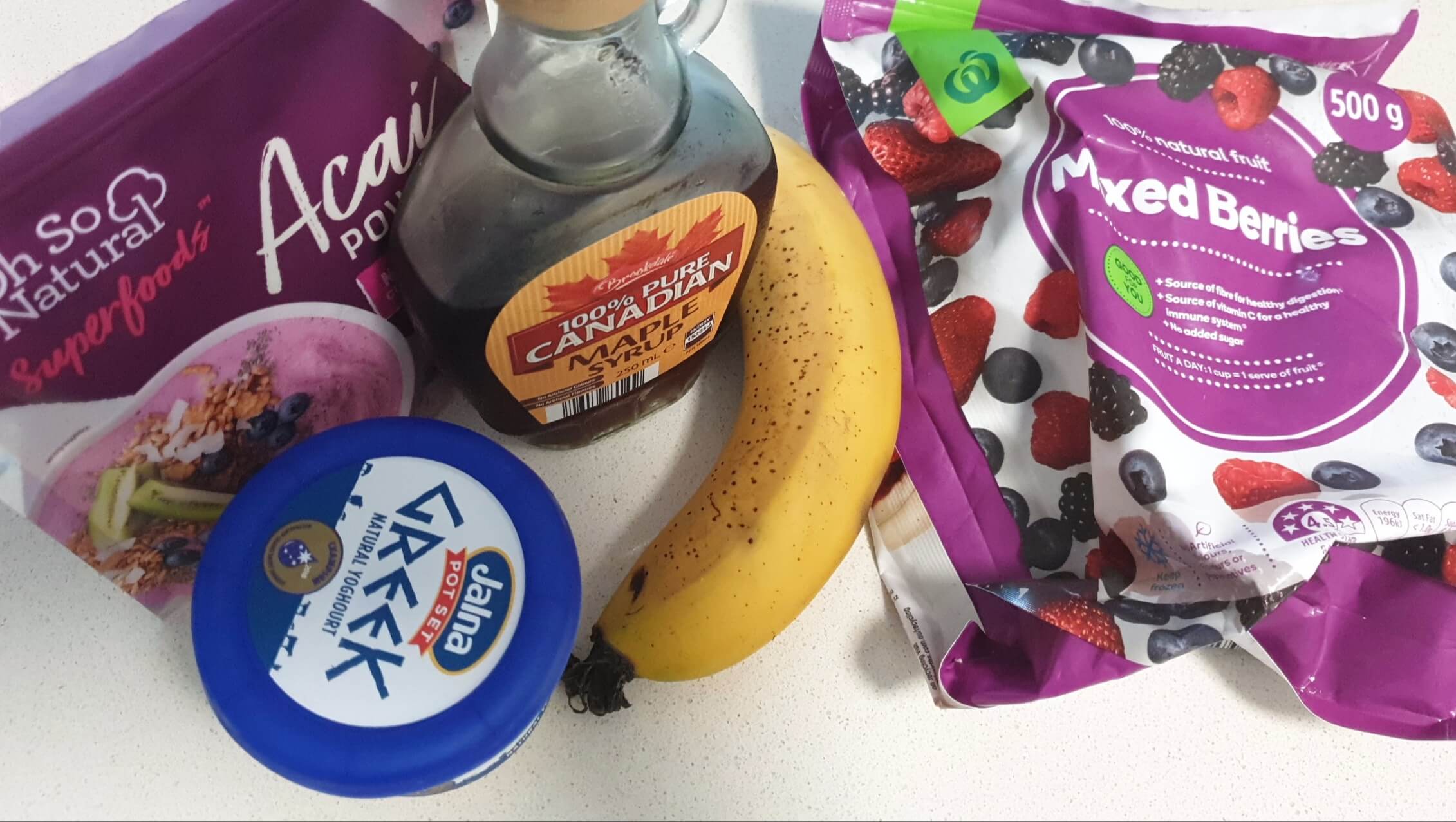 재료- 냉동 믹스베리, 바나나, 메이플 시럽이나 꿀, 플레인 요거트, 아사이 파우더
