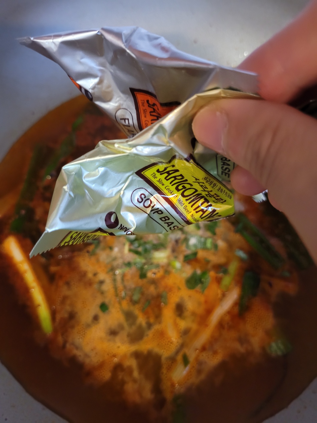 바로 사리곰탕으로 끓이는 육개장 라면이었어요.