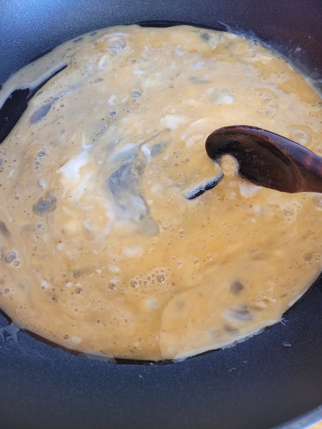 식용유를 두른 팬에 풀어놓은 계란을 넣고