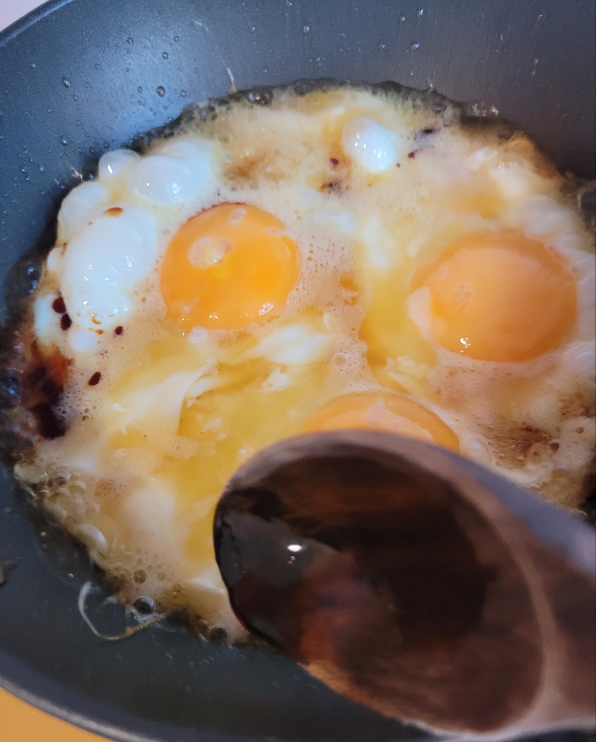 국간장 1큰술을 팬 가장자리로 둘러주세요.