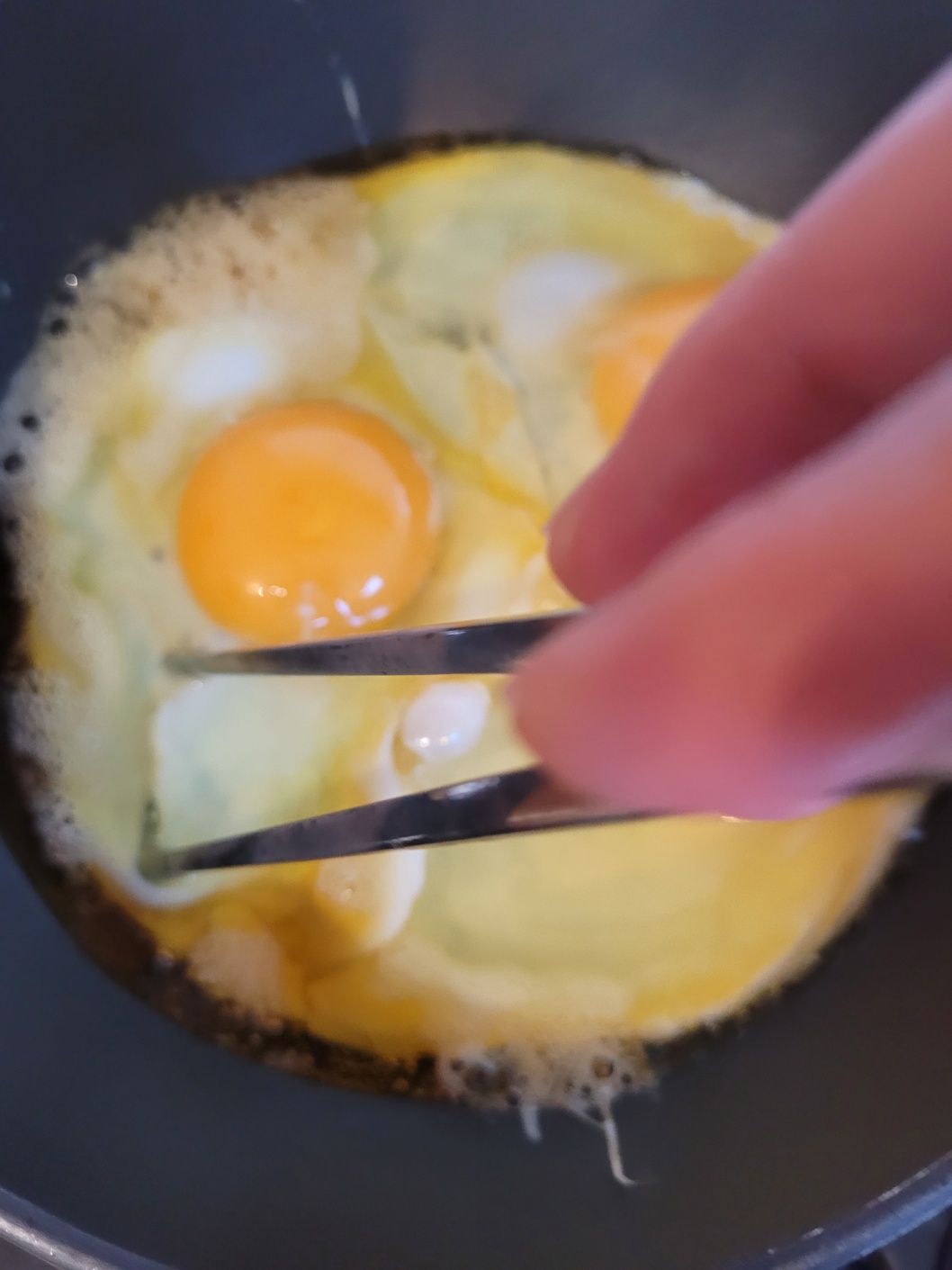 계란 밑으로 기름이 완전히 통과하게 만들어 줍니다.