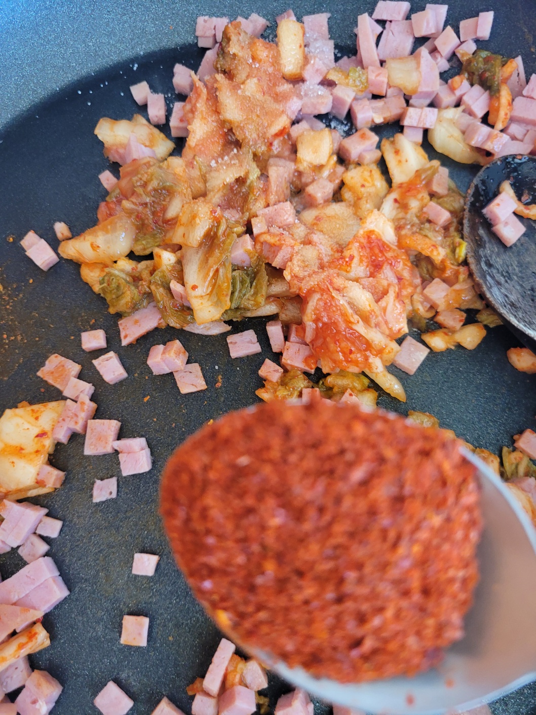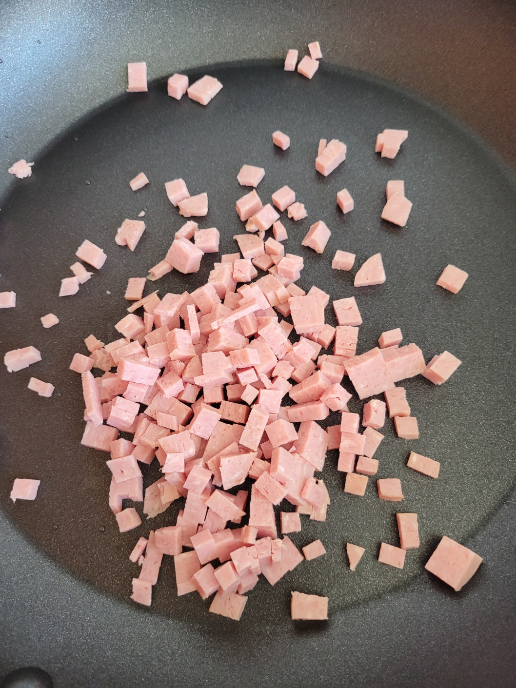 팬에 스팸을 먼저 넣어 볶아주세요.