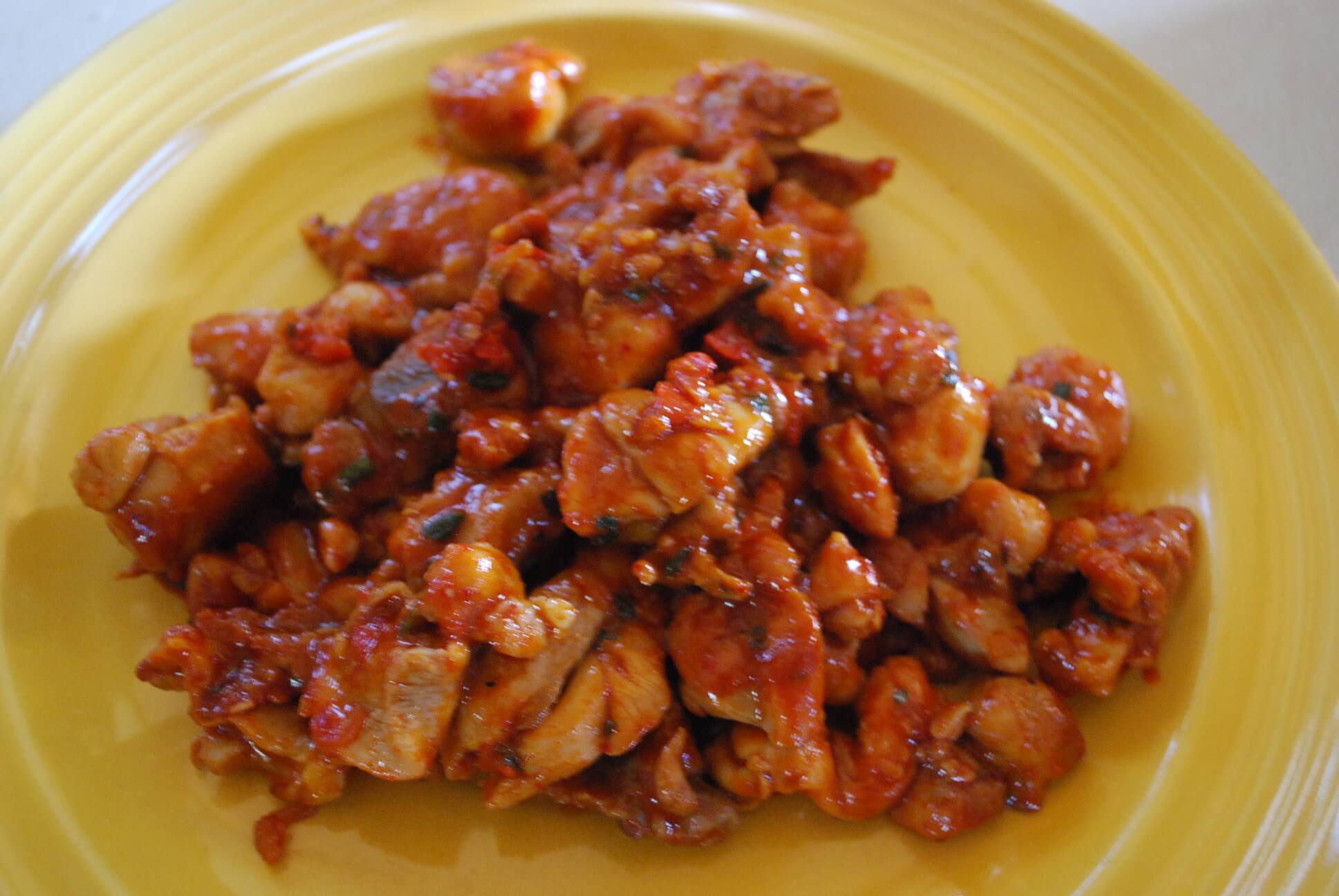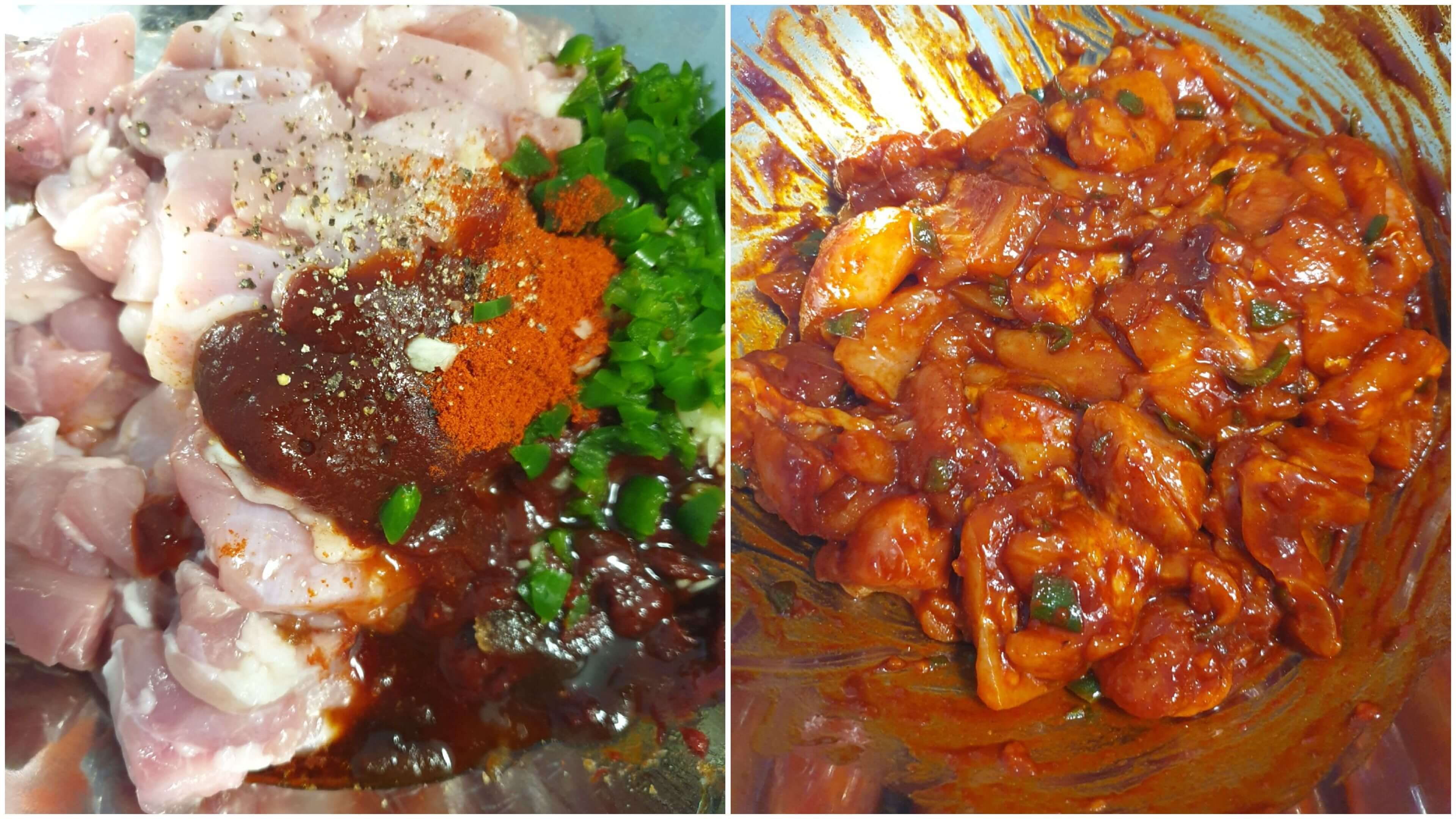 재료- 닭 허벅지살, 고추장, 고춧가루, 간장, 맛술, 참기름