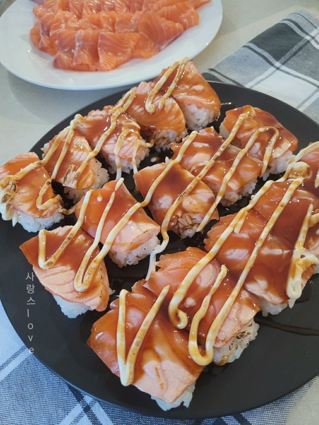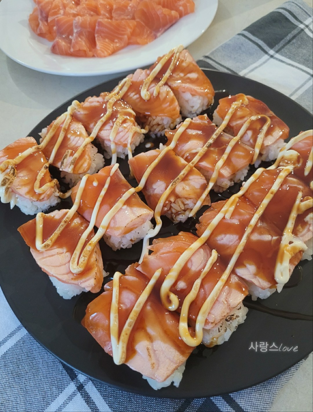 한 접시는 연어 아부리로 준비해 보았어요.