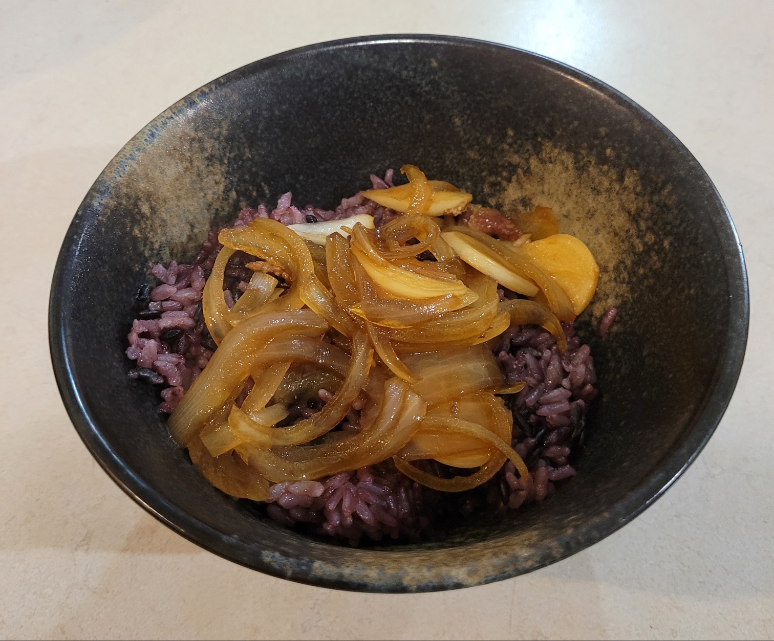 밥 위에 양파와 소스를 적당히 뿌리고