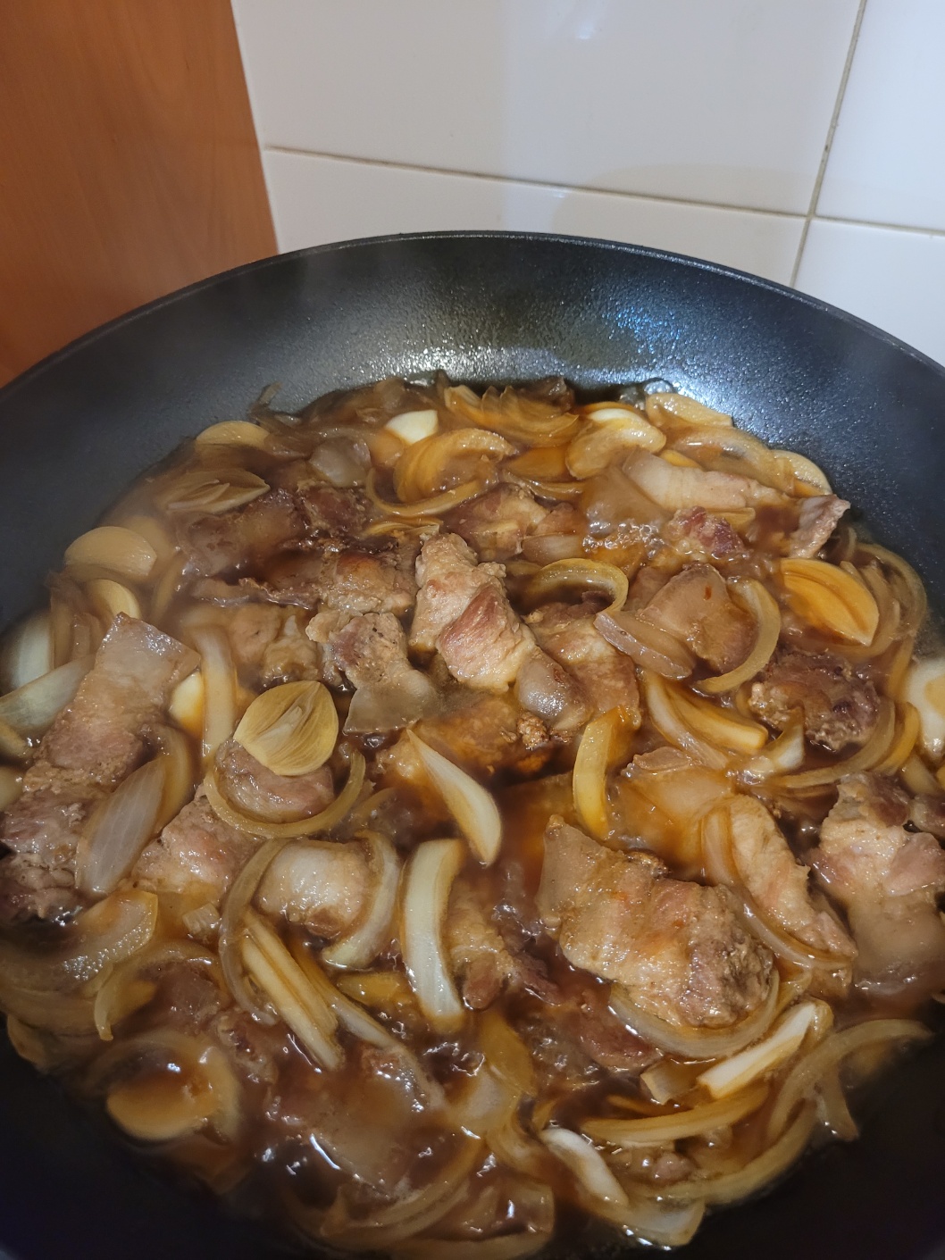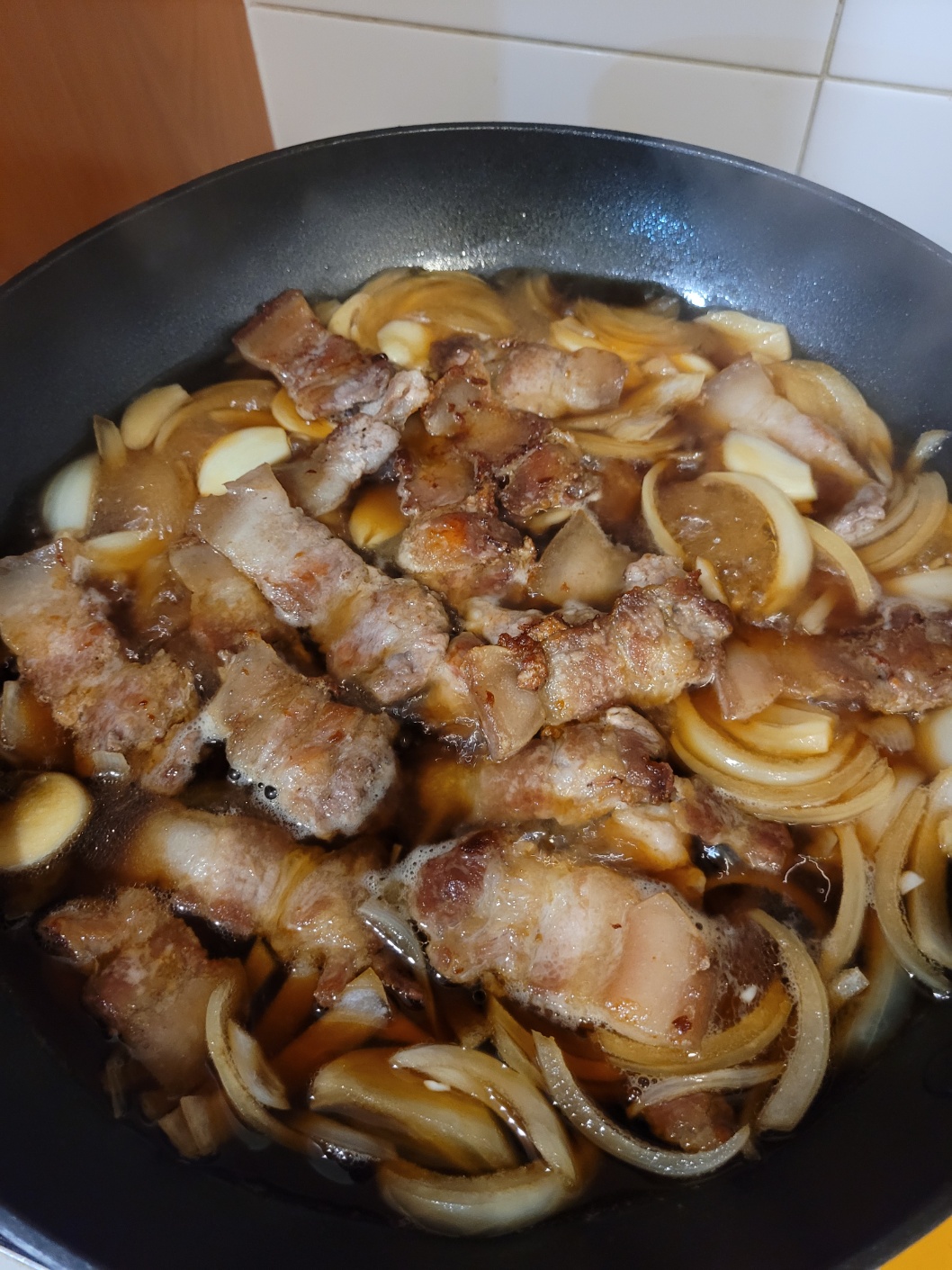 양파와 마늘, 구운 삼겹살을 넣고 졸여주세요.