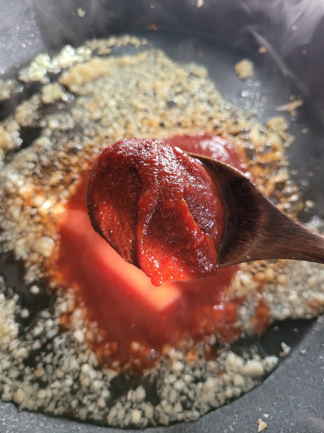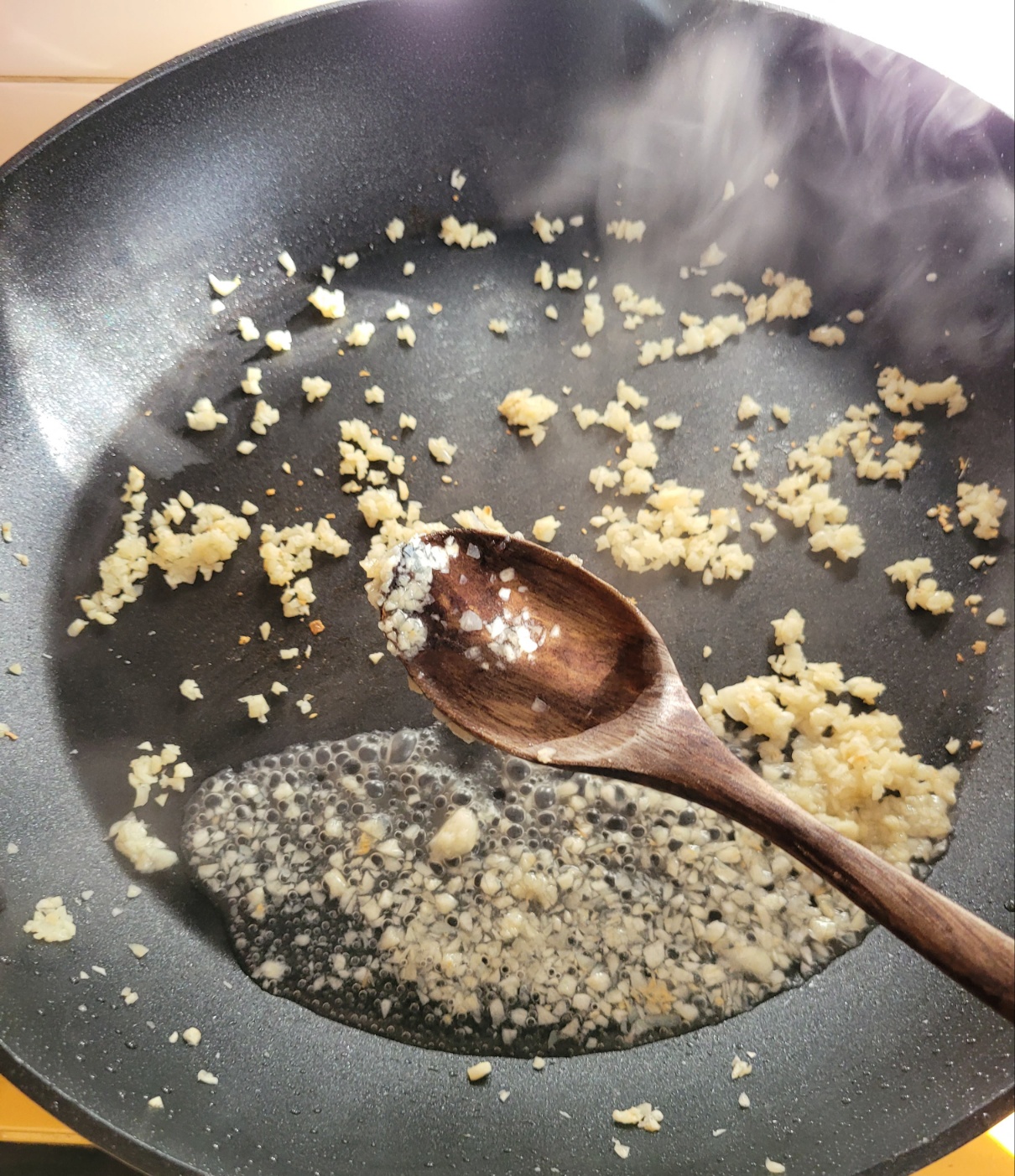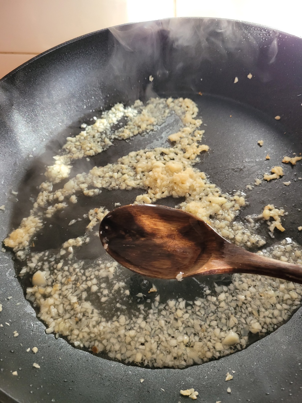 마늘은 팬에서 그대로 으깨주세요.