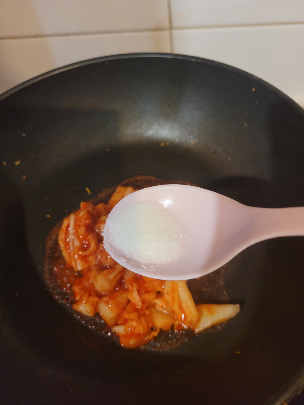 저는 볶은 김치를 밥 위에 올리고