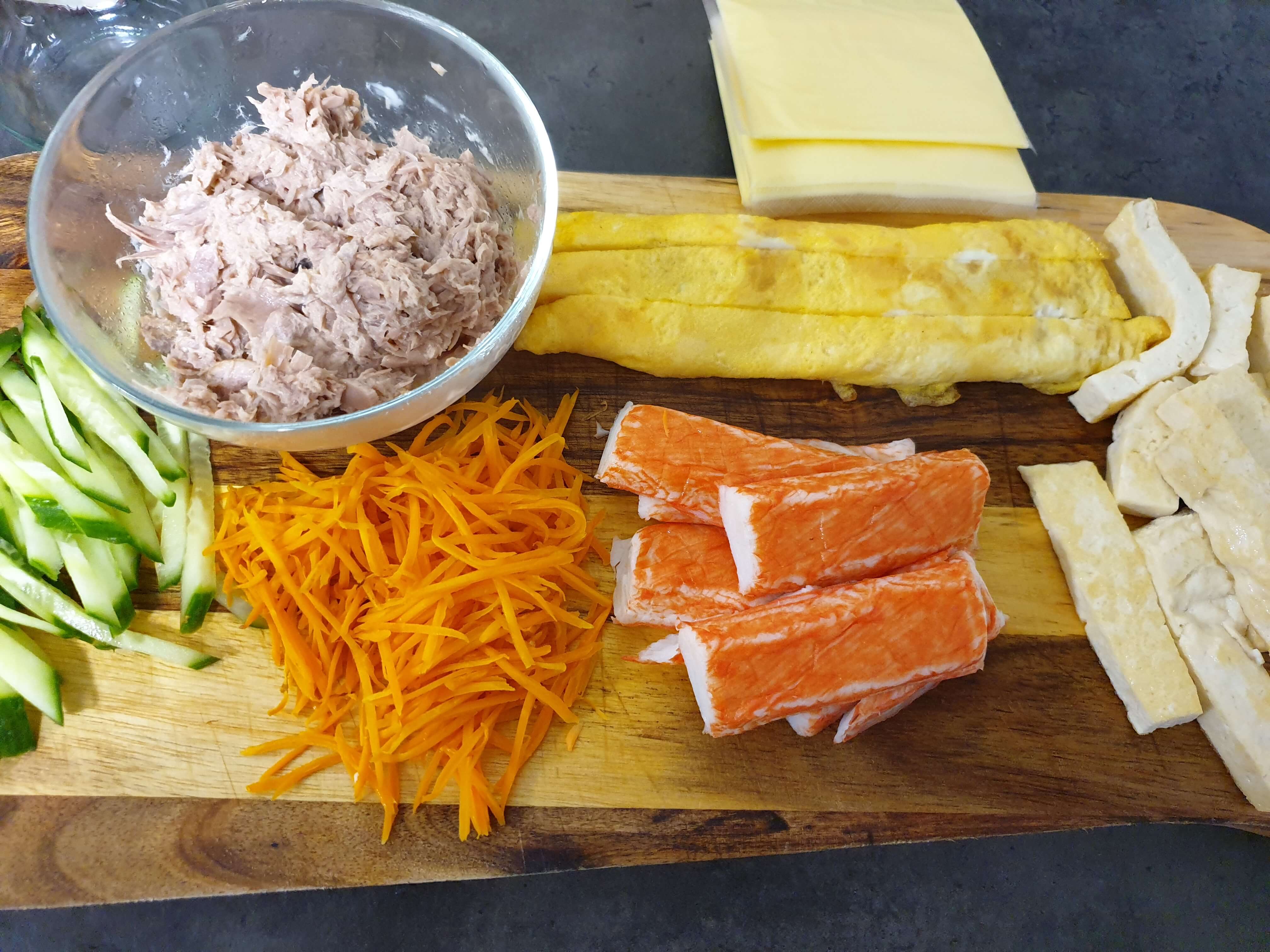 재료- 참치, 마요네즈, 두부, 당근, 계란, 오이, 맛살, 김