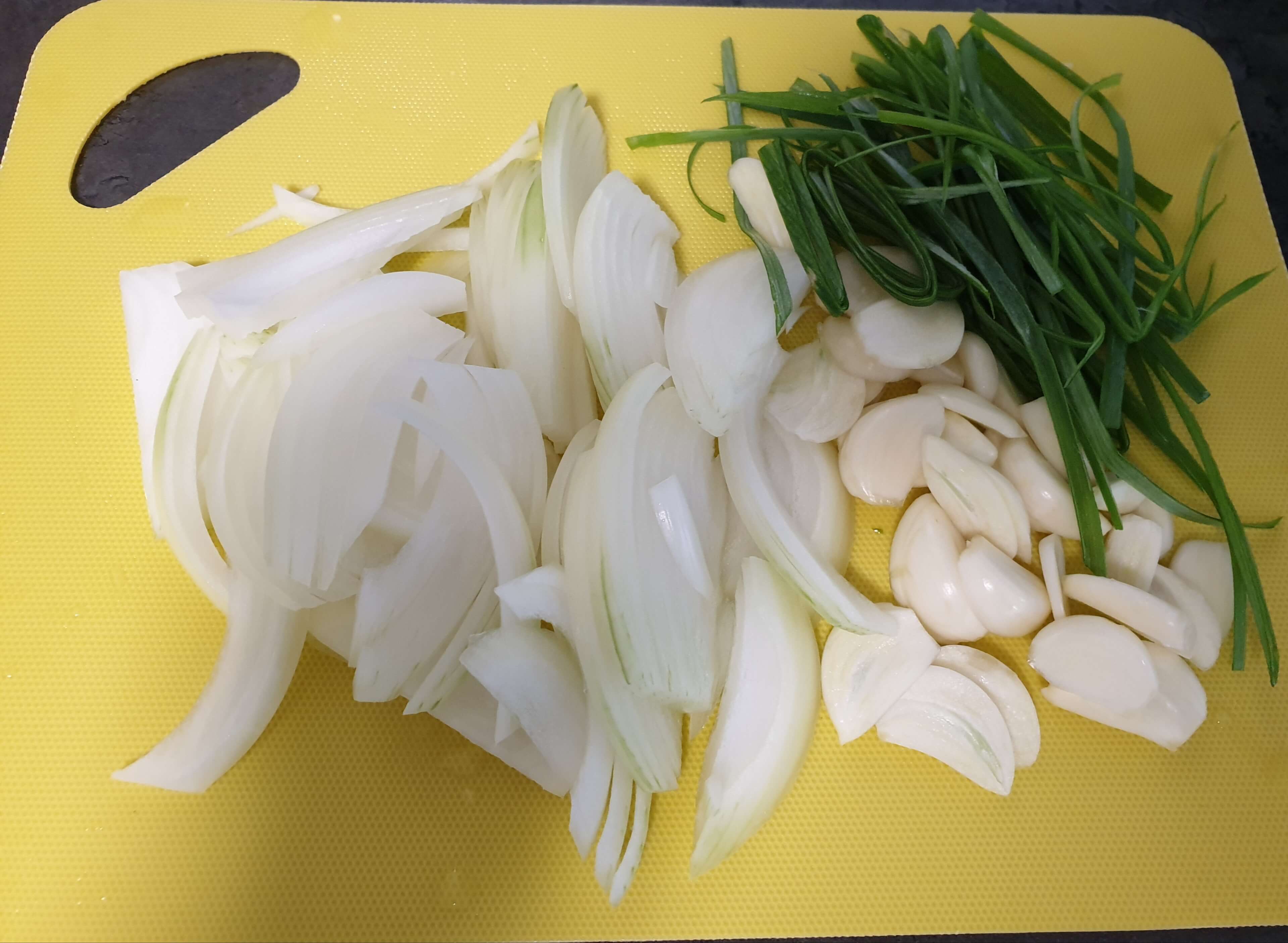 야채는 양파 한 개 반, 마늘은 6개 정도 편 썰어 주고