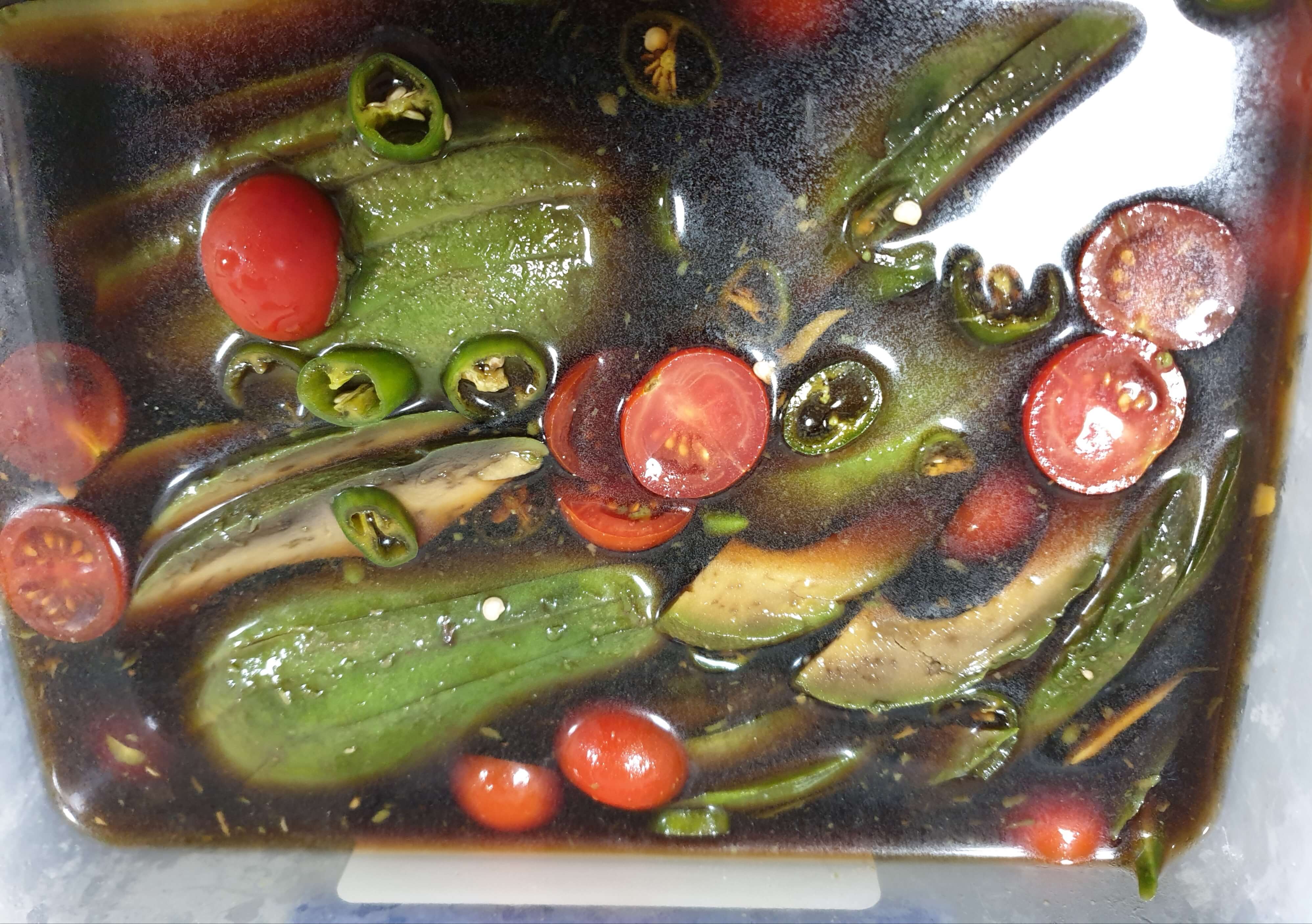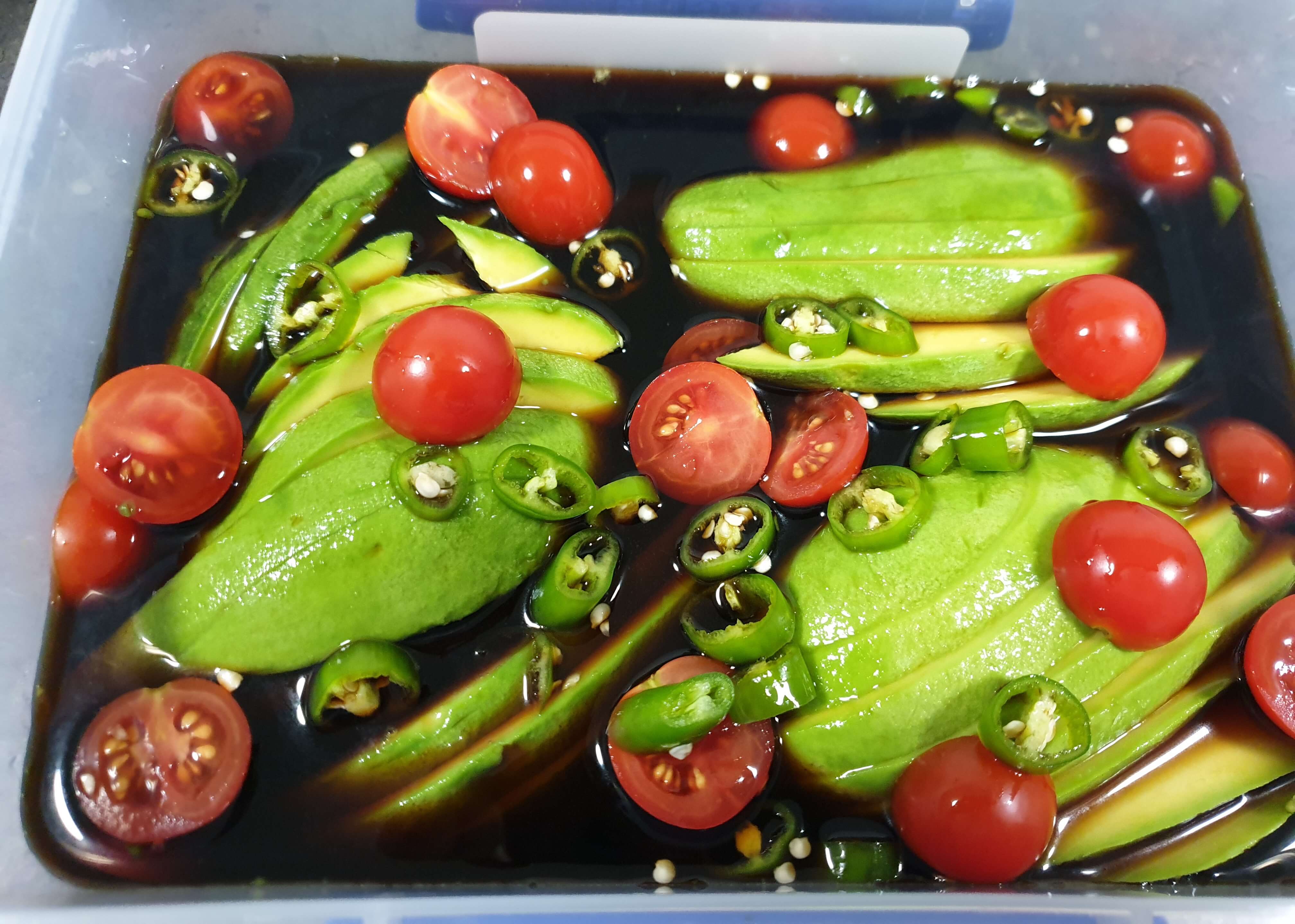재료- 아보카도, 방울토마토, 청양고추, 간장, 물, 설탕