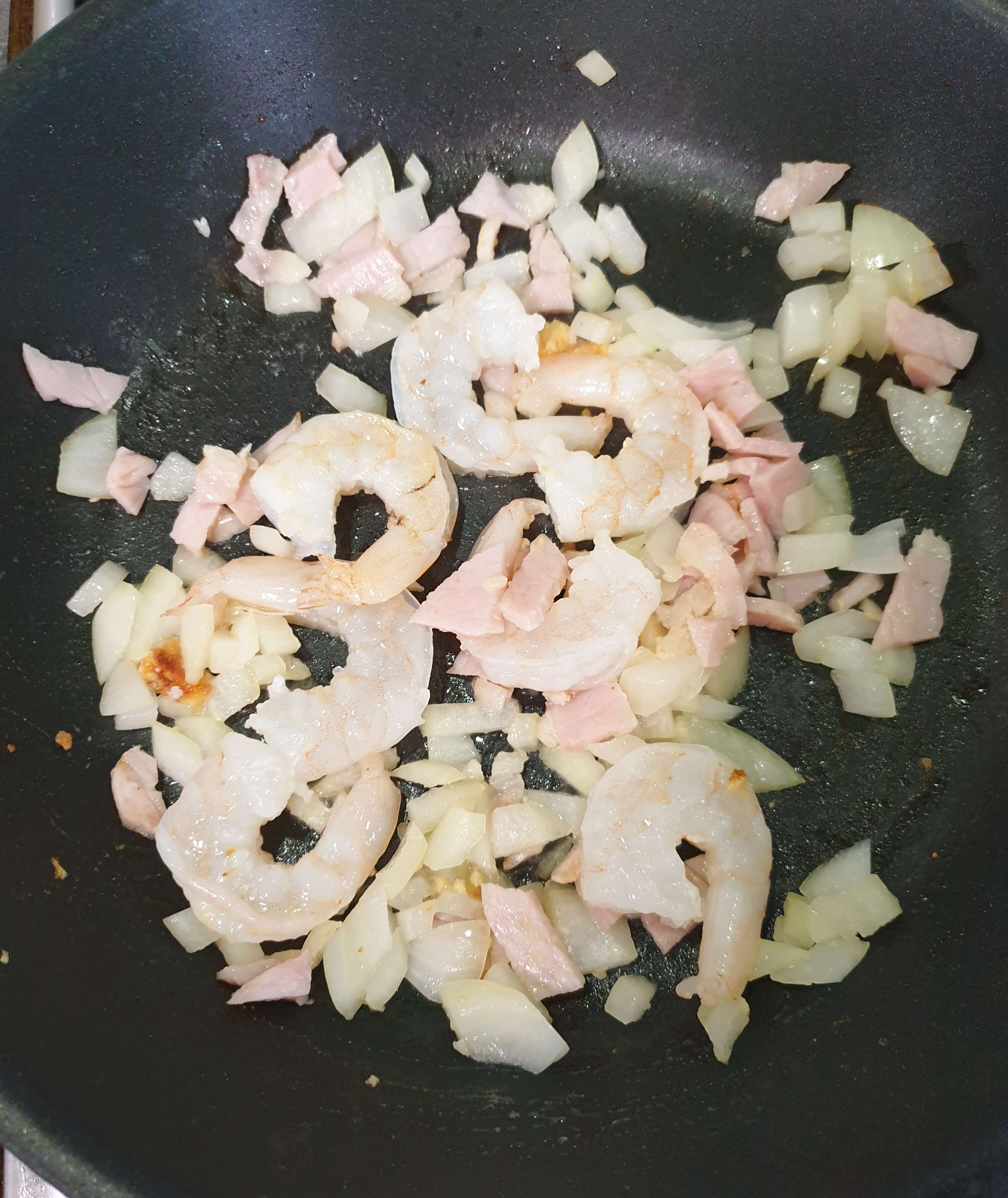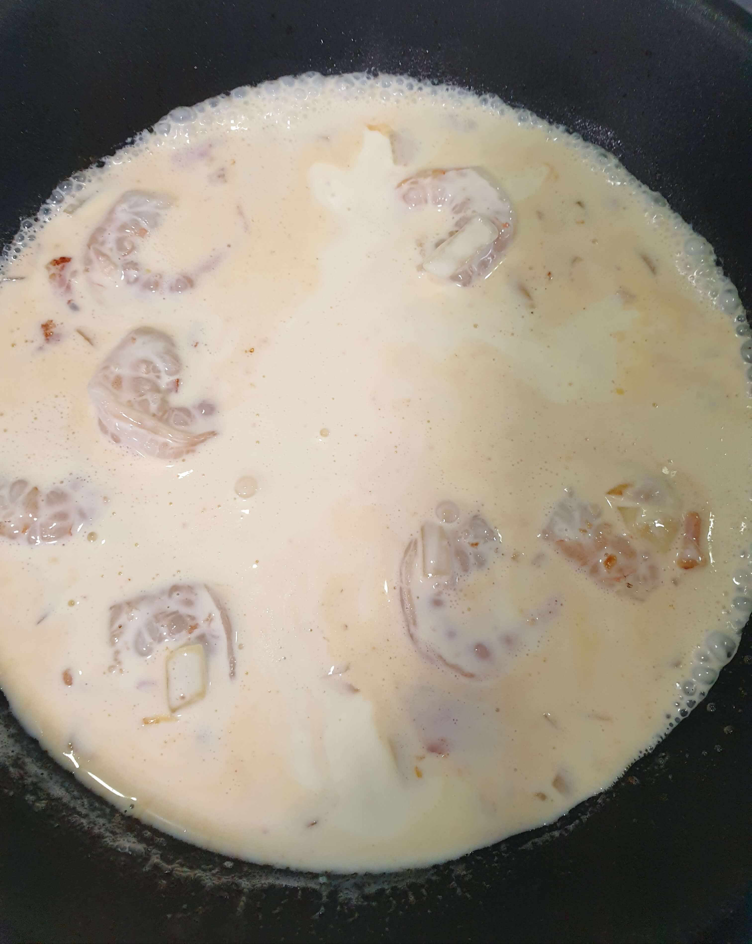 소스- 생크림, 새우, 양파, 베이컨, 후추, 치즈, 다진 마늘