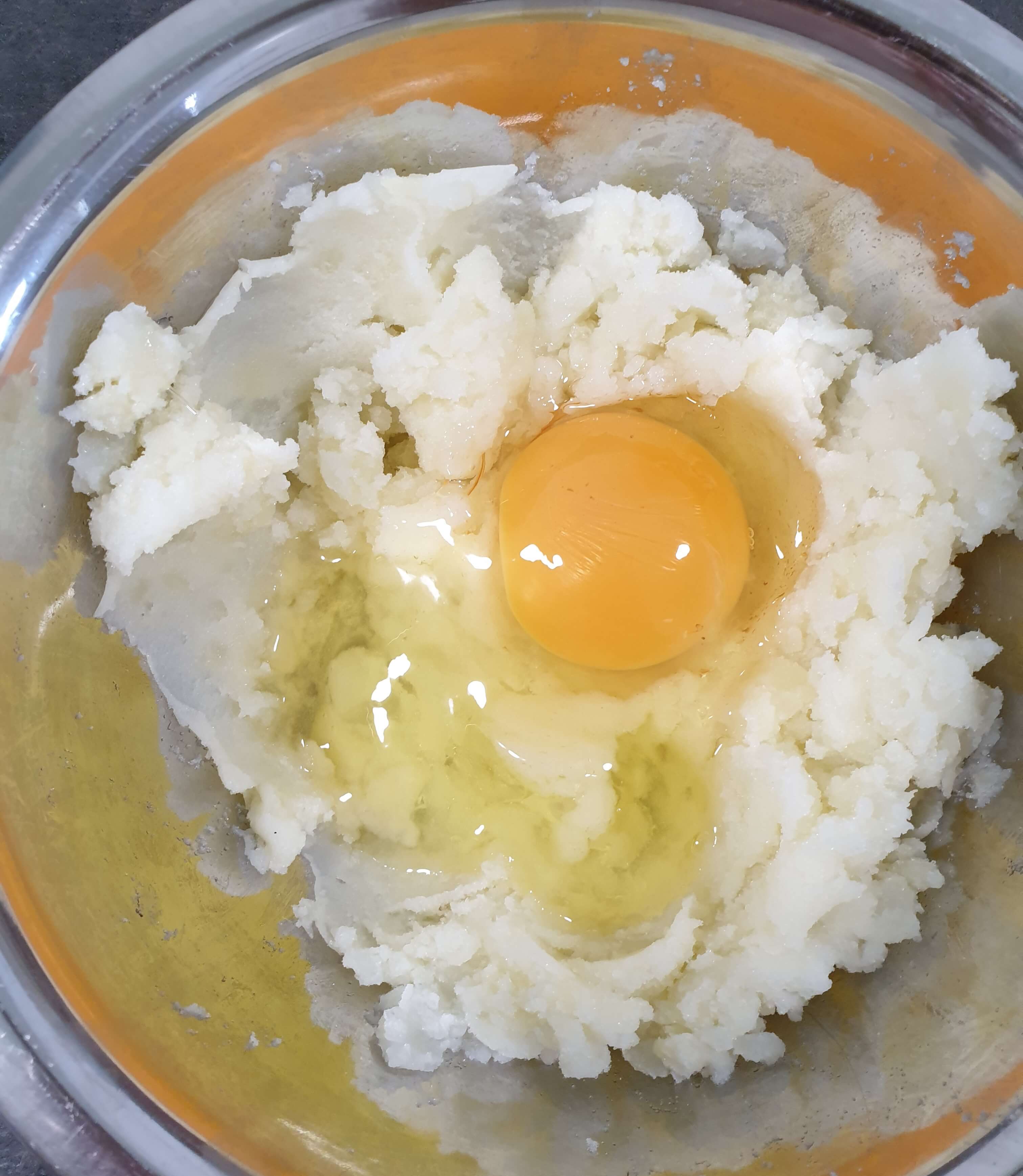 으깬 감자에 계란 한 개를 넣어서 섞어준 후