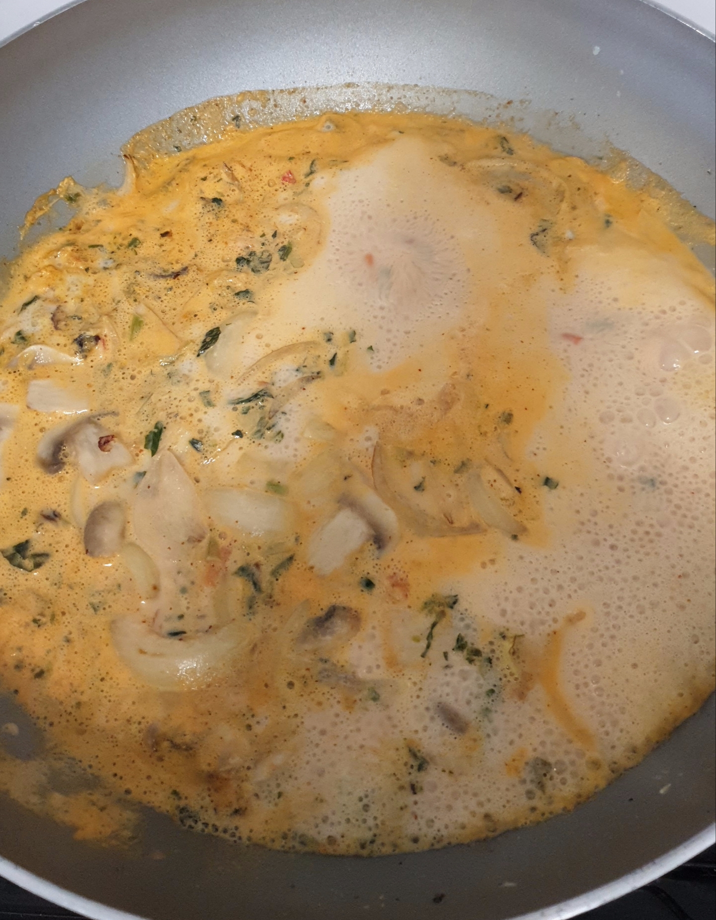 우유 400ml, 물 200ml, 편 마늘, 양파, 버섯