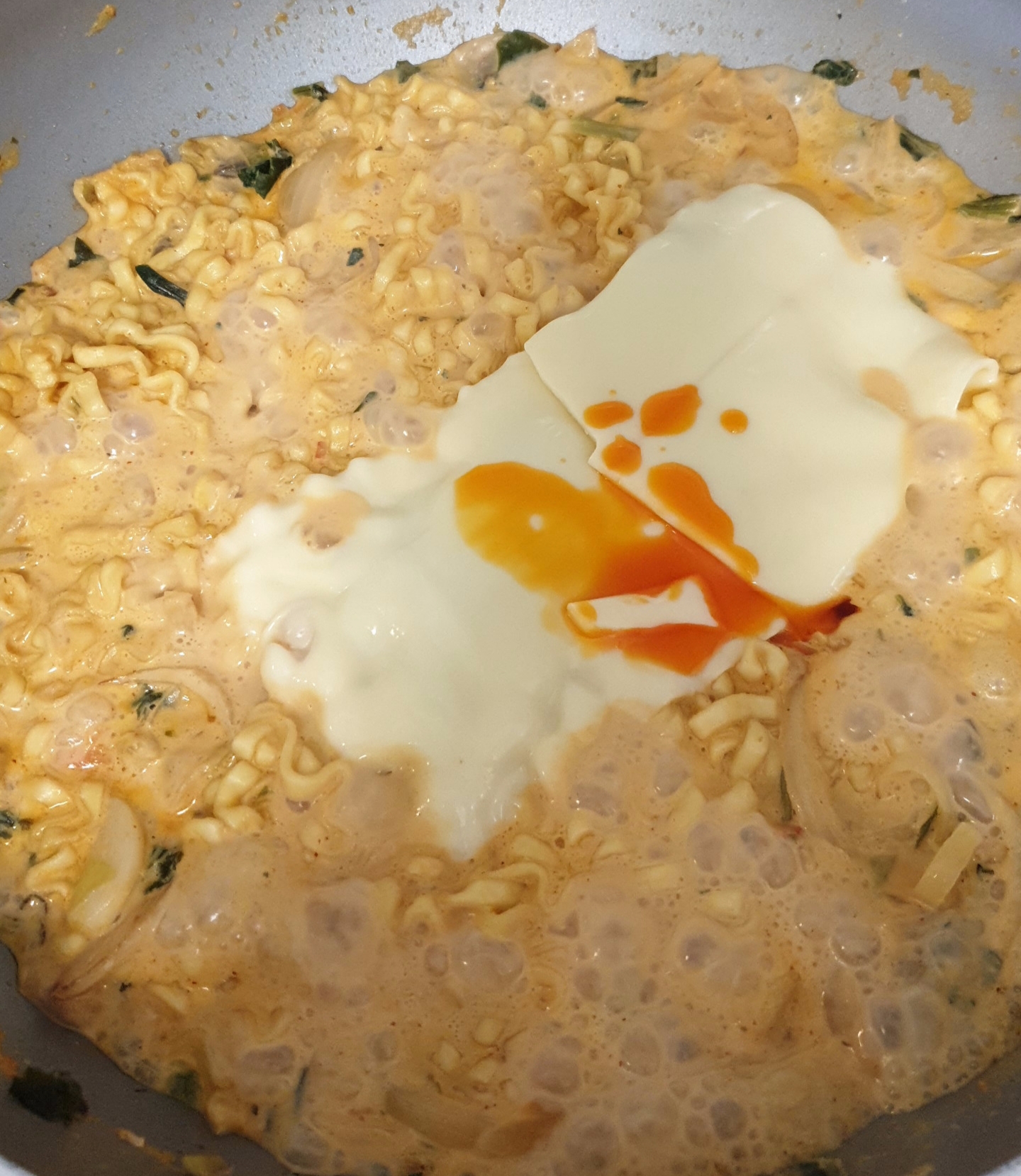 치즈 두장과 유성 스프를 넣고