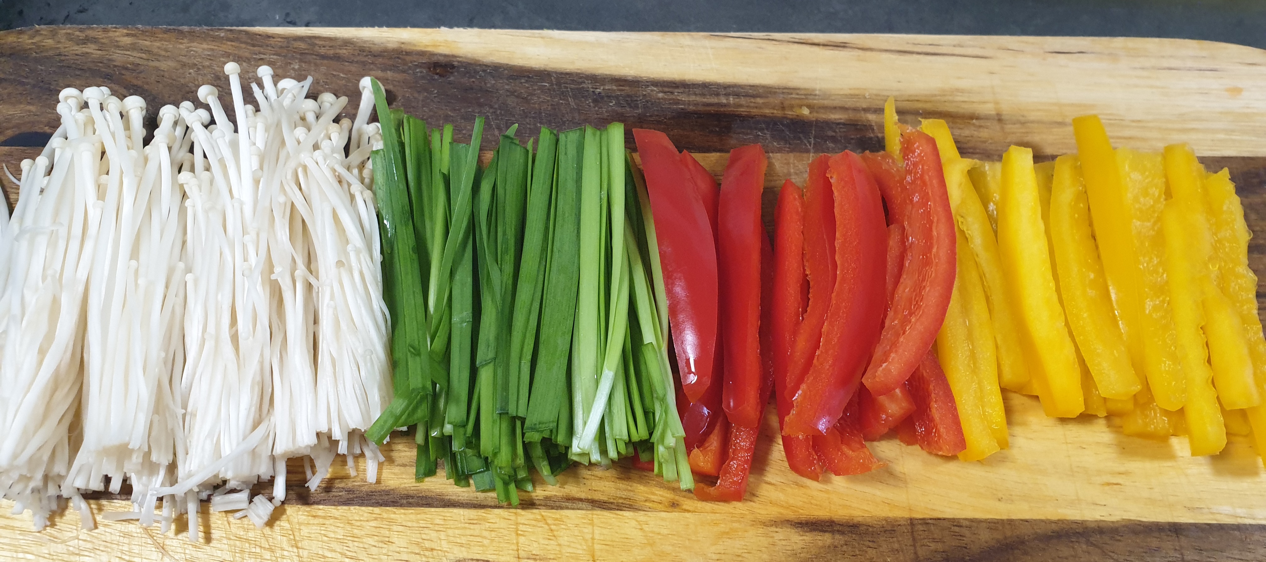먼저 팽이버섯과 부추, 두 가지 색 파프리카를