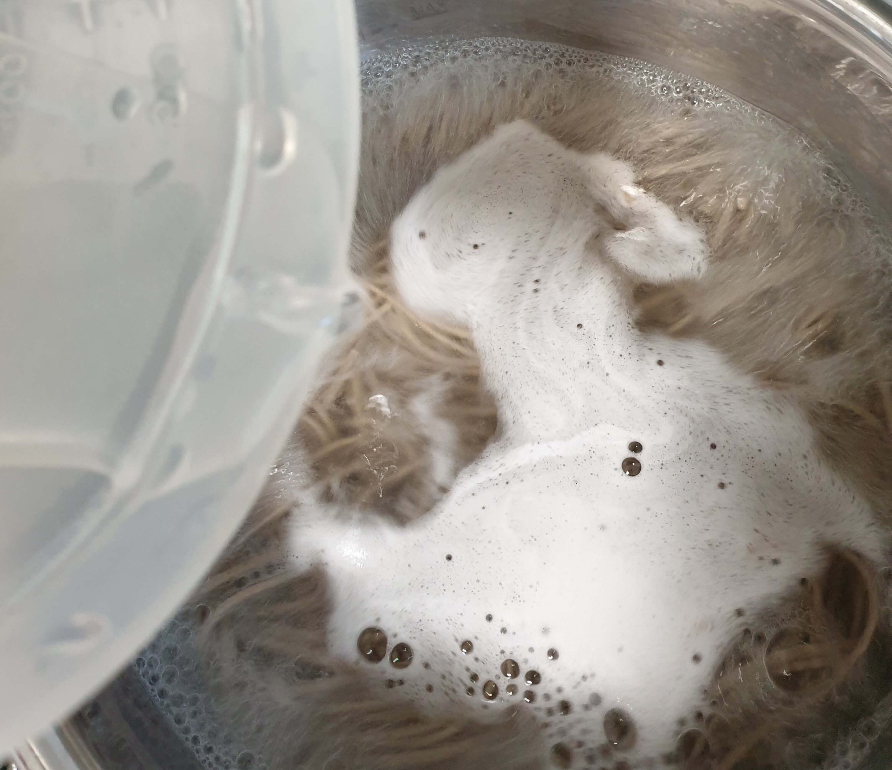 3분이 지난 후 찬물로 샤워시켜 줬어요