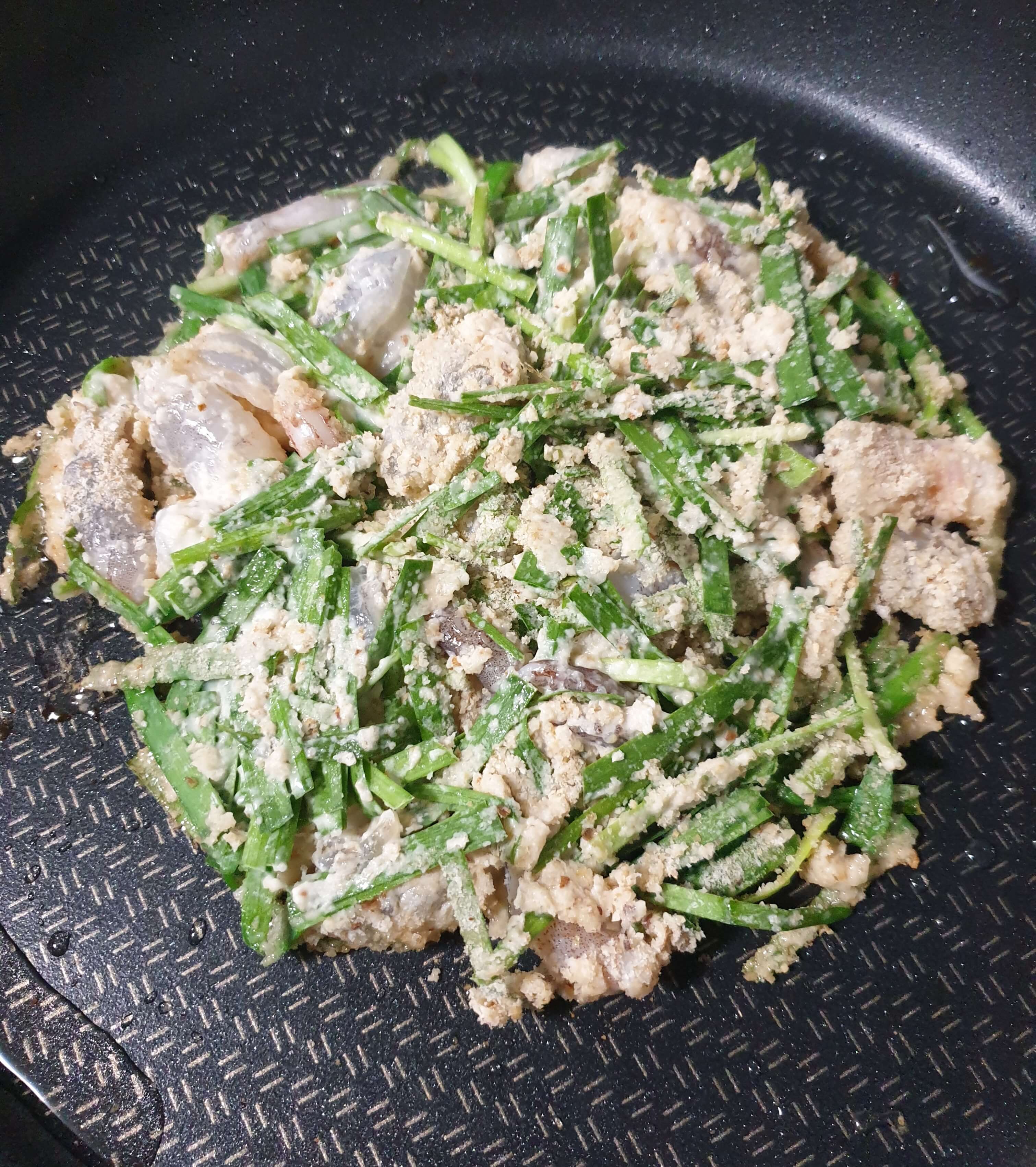 팬에 부추전을 부치기 바로 직전에
