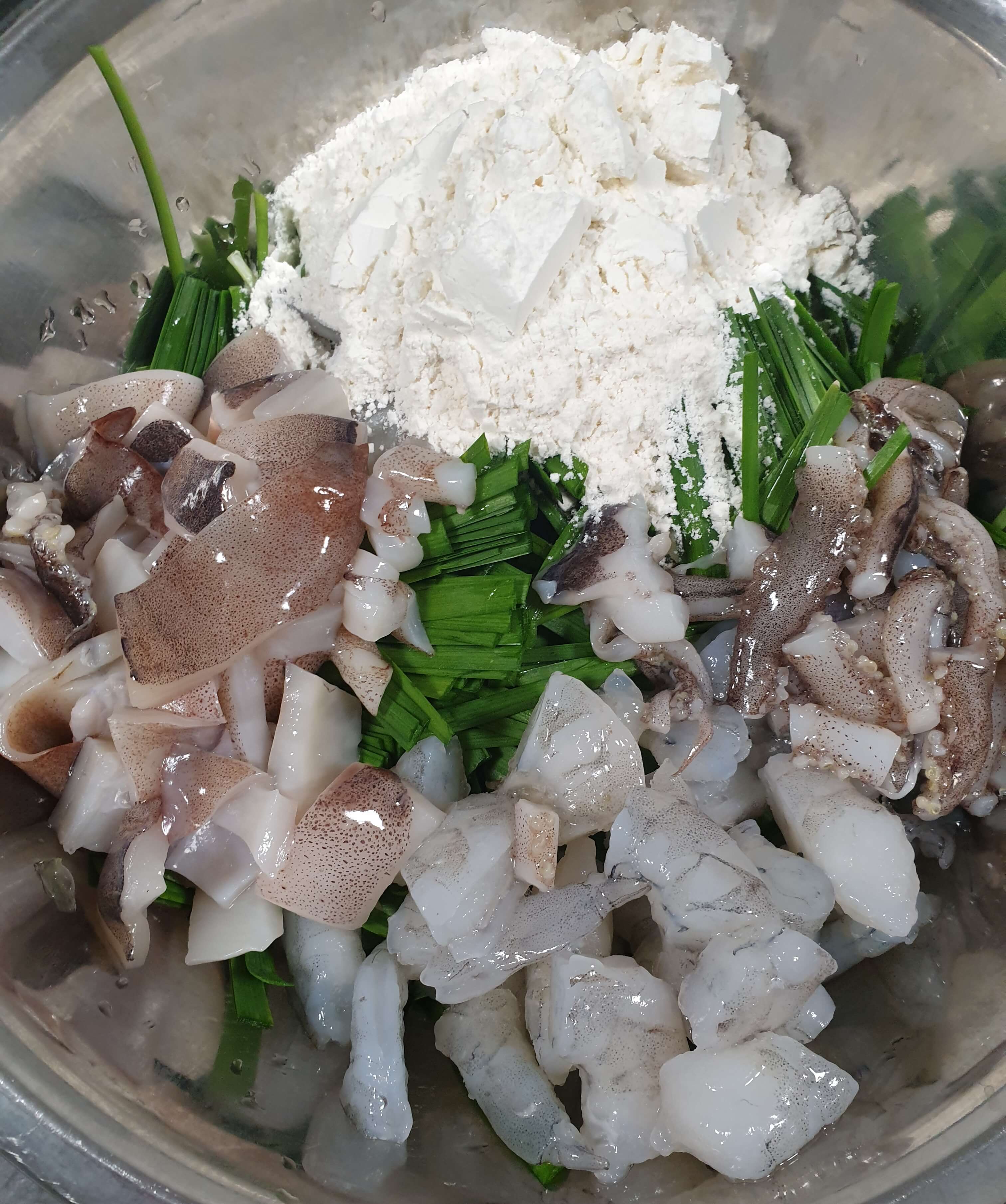 재료- 부추, 오징어, 새우, 부침가루, 튀김가루, 기름