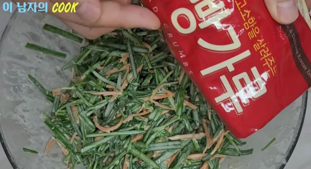빵가루와 부추전 반죽을 1:2 비율로 섞어 주세요