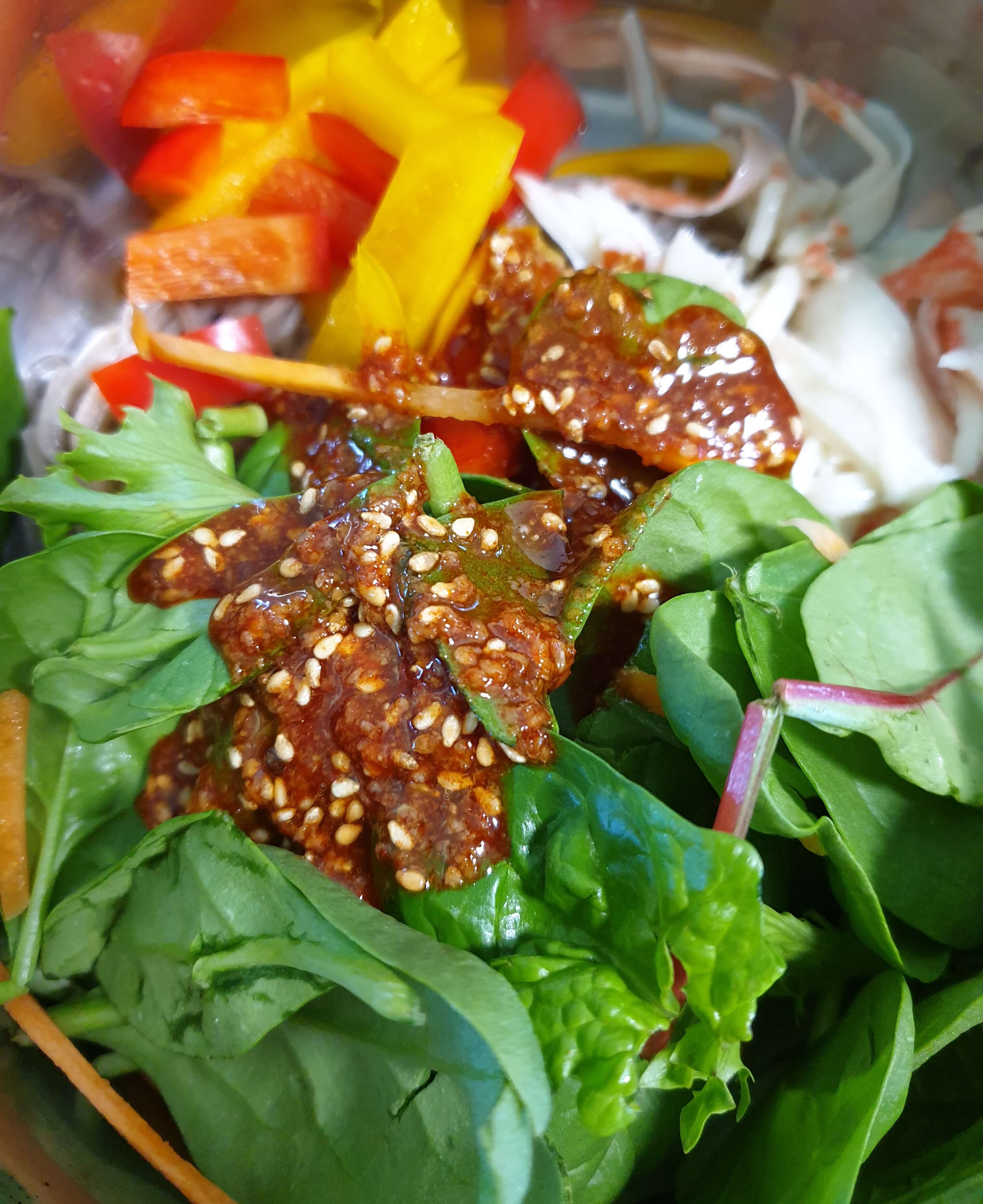 재료- 메밀면, 샐러드 야채, 파프리카, 맛살, 삶은 달걀