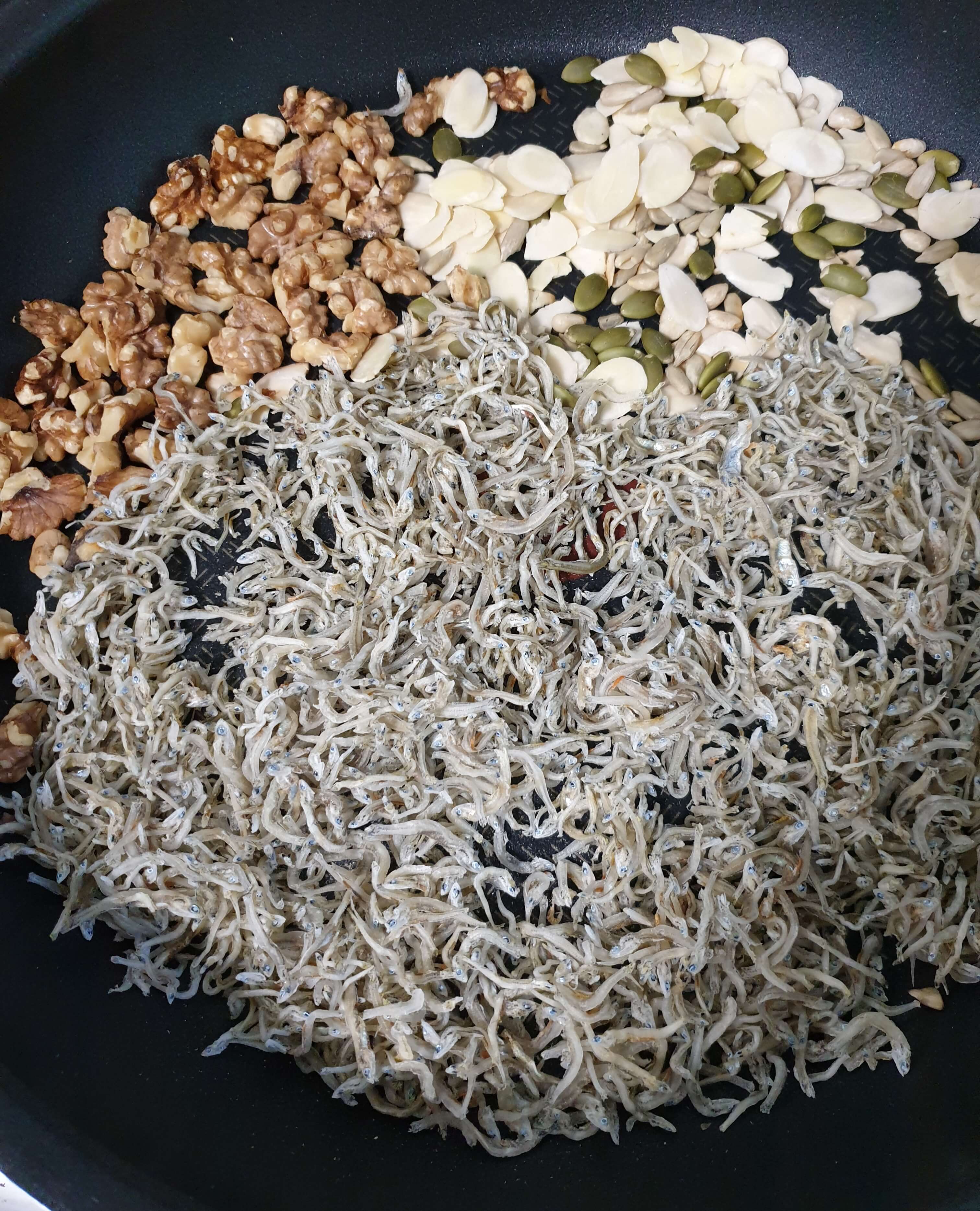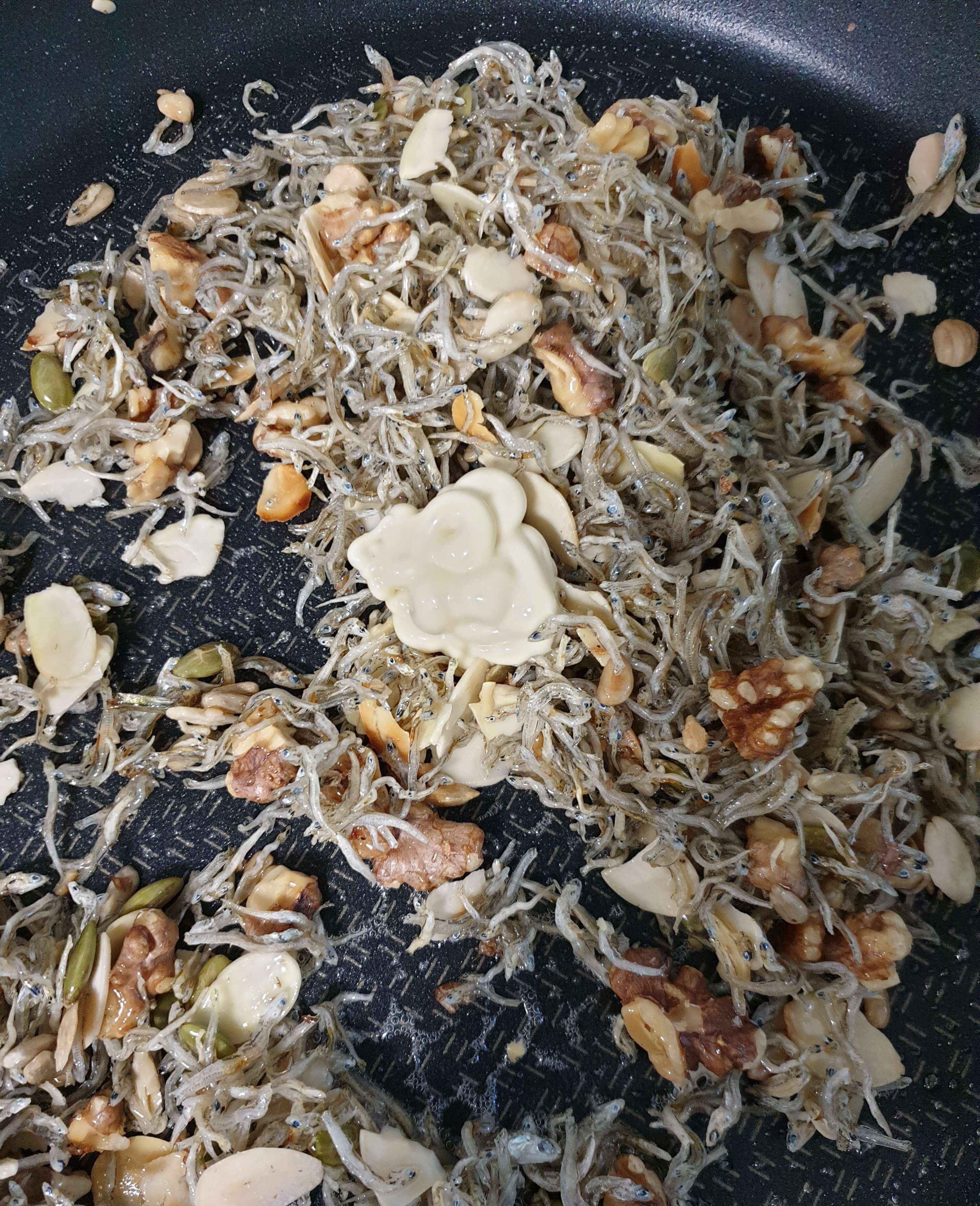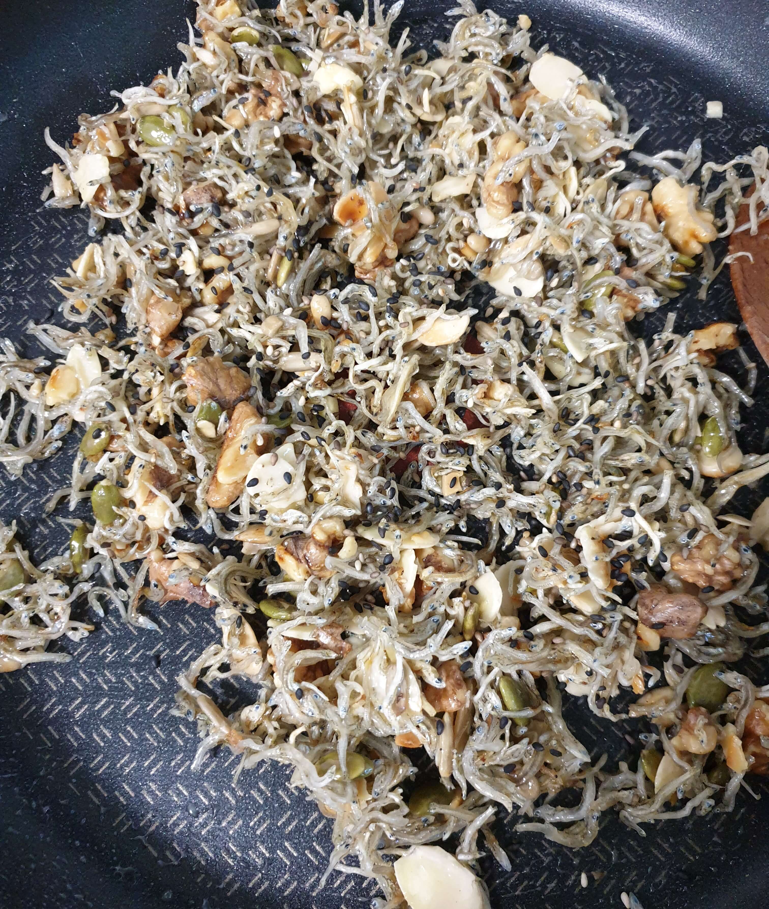 재료- 견과류, 잔멸치, 올리고당, 마요네즈, 통깨