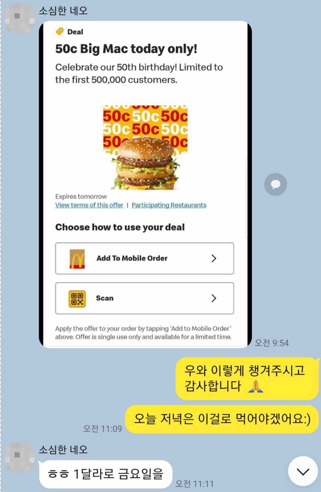 맥도날드 어플 있는 사람 한 명당 한 개씩만 가능해요