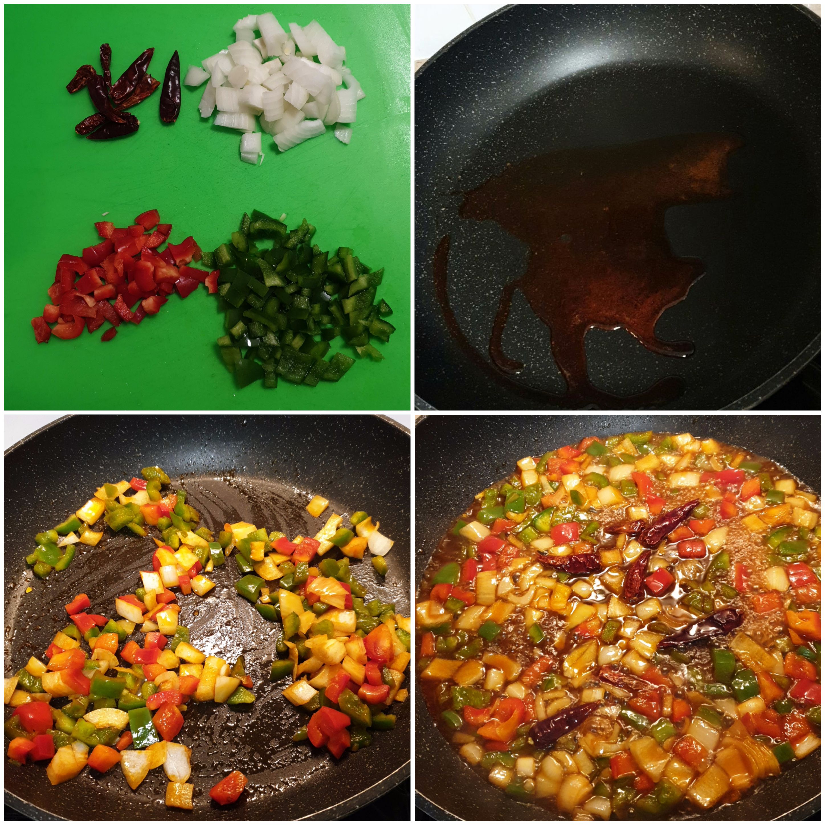 파프리카 두 가지 색, 양파, 건고추로 준비했어요