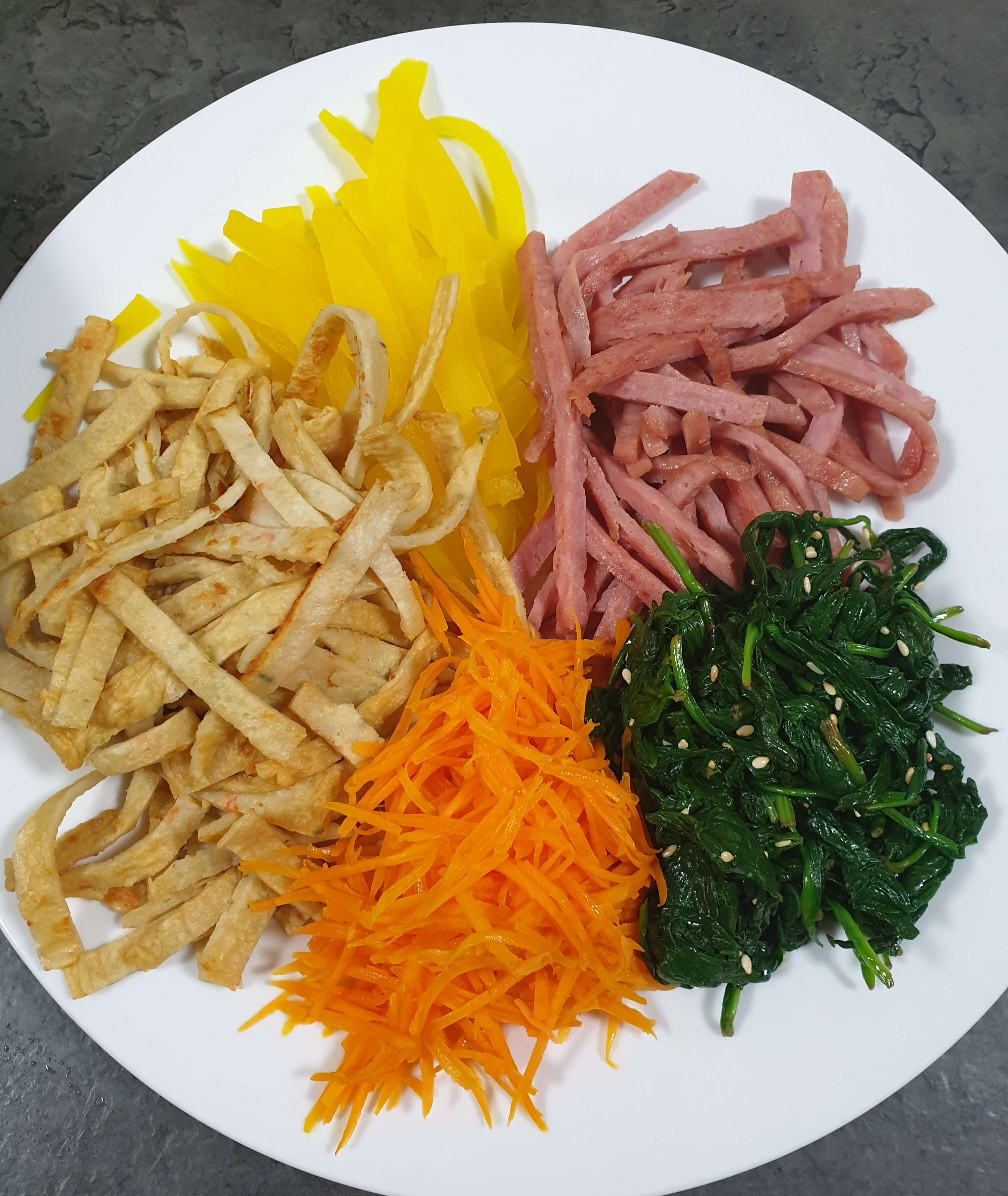 어묵, 단무지, 햄, 당근, 시금치를