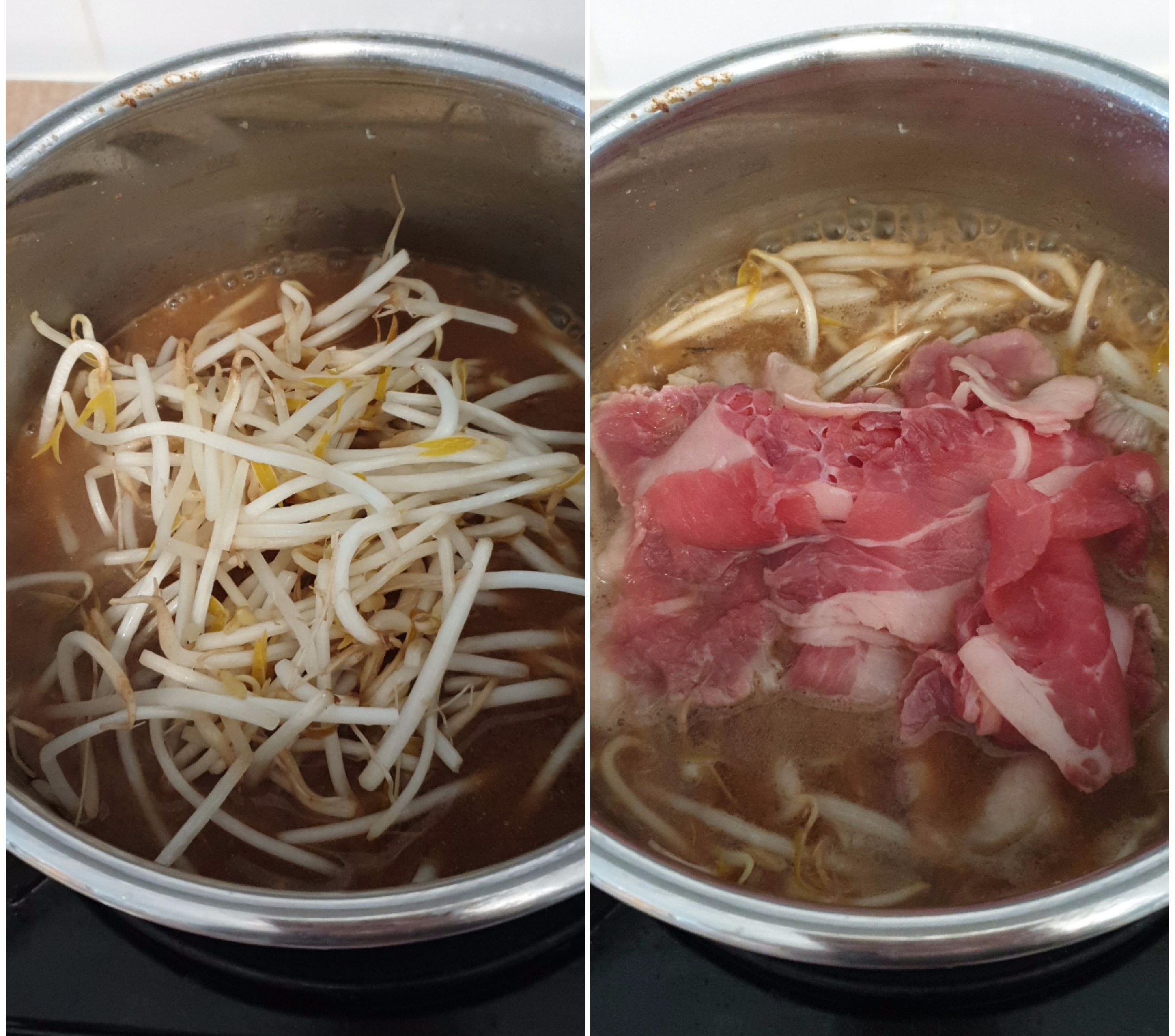 숙주와 차돌박이를 넣고 팔팔 끓여 주세요