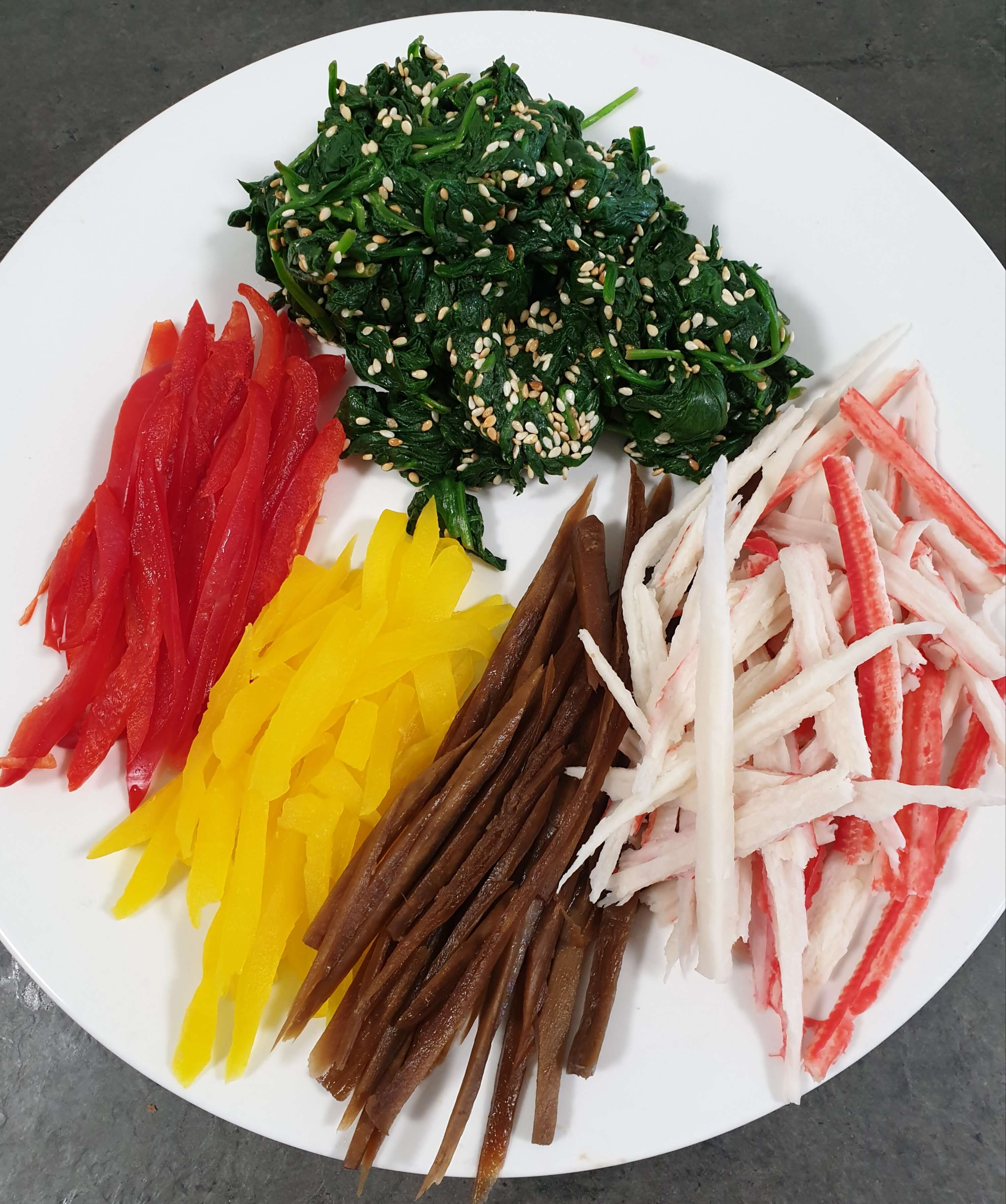 시금치, 빨간 파프리카, 단무지, 우엉